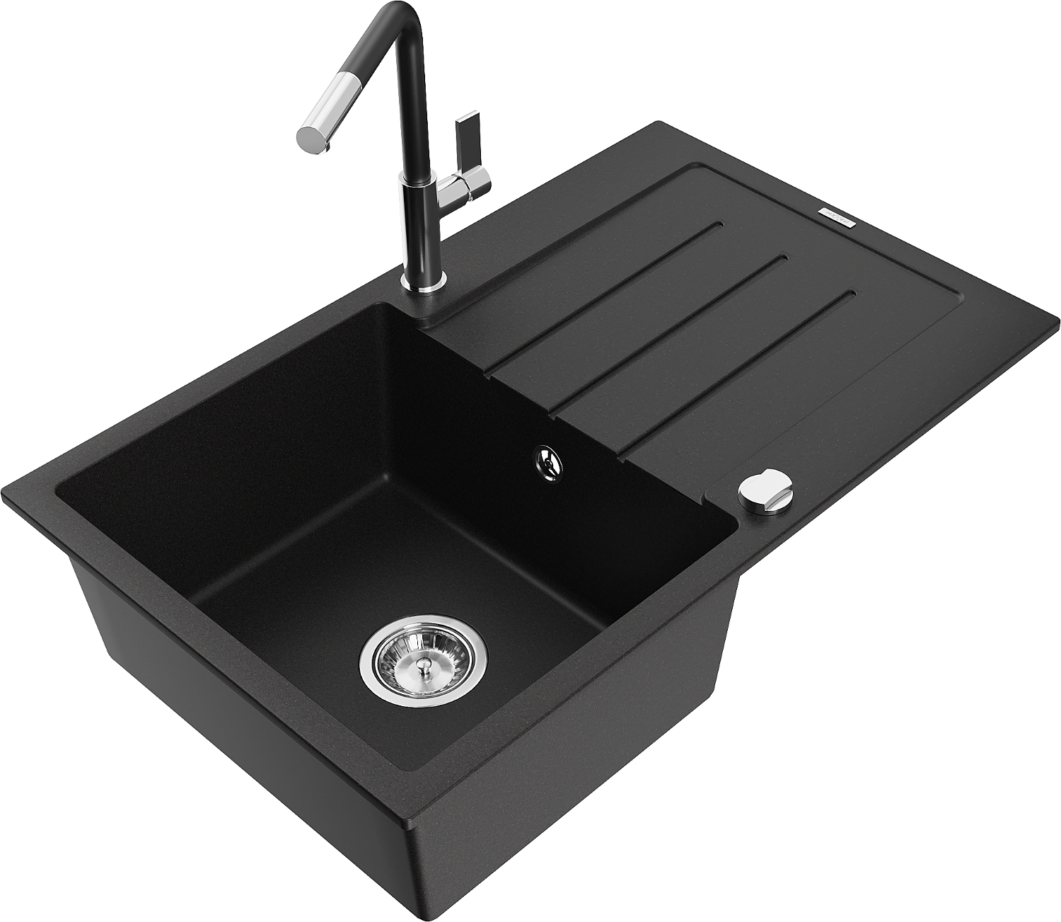 Mexen Bruno granieten gootsteen 1-kompartment met afdruiprek en keukenmengkraan Flora, zwart - 6513-77-670401-07