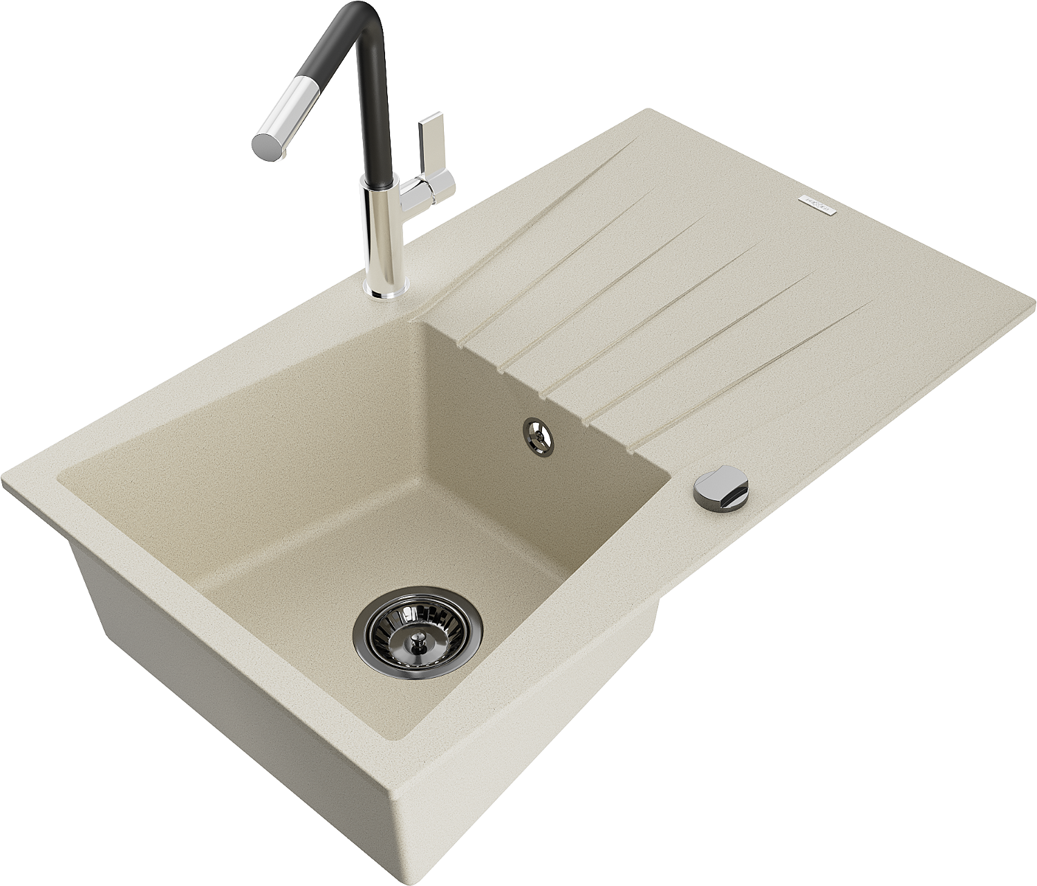 Het oppervlak van de gootsteen is bestand tegen vlekken en verkleuringen, waardoor het gemakkelijk schoon te houden is en zijn kleur behoudt gedurende een lange gebruiksperiode. Een esthetische en praktische aanvulling op elke keuken.