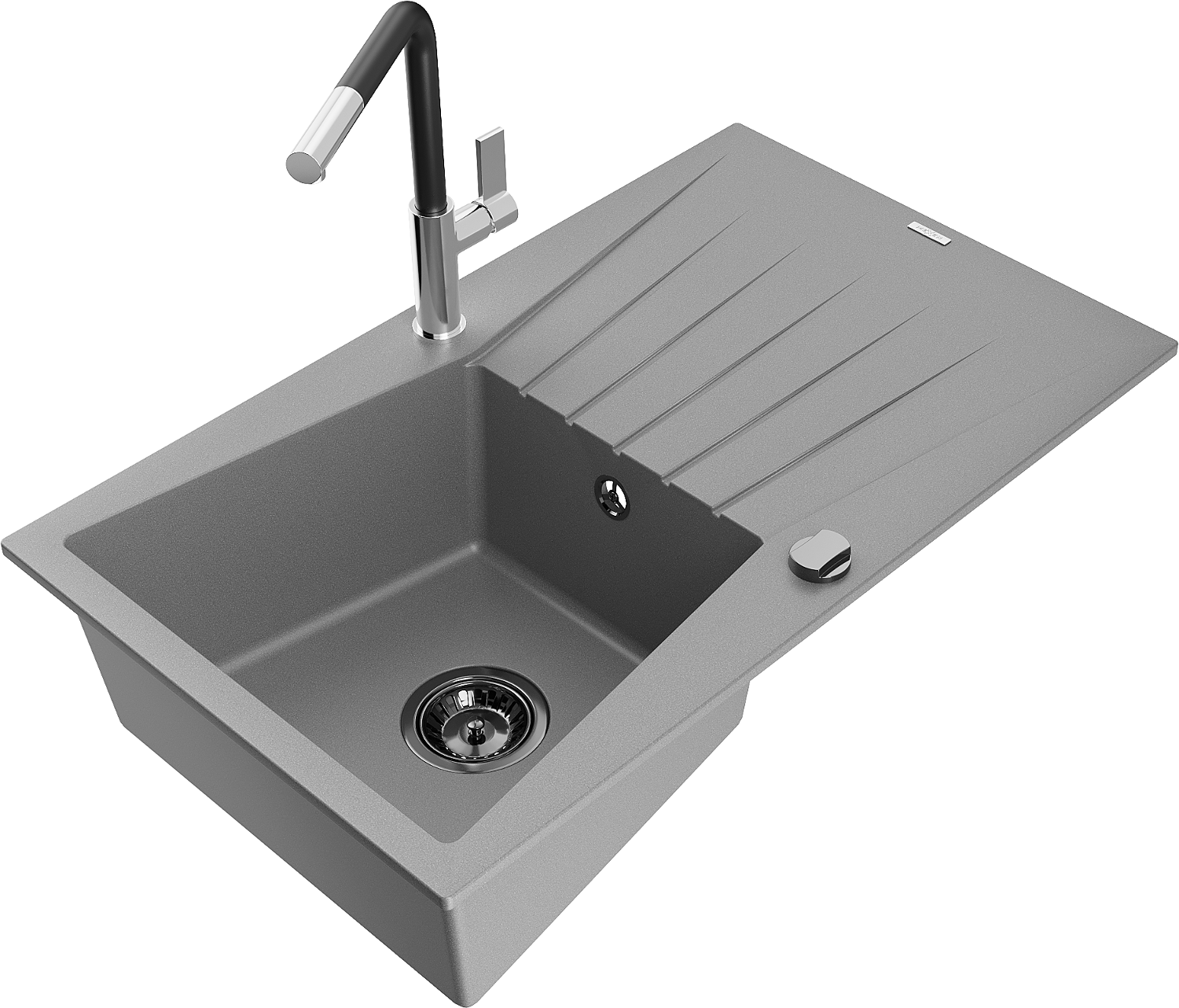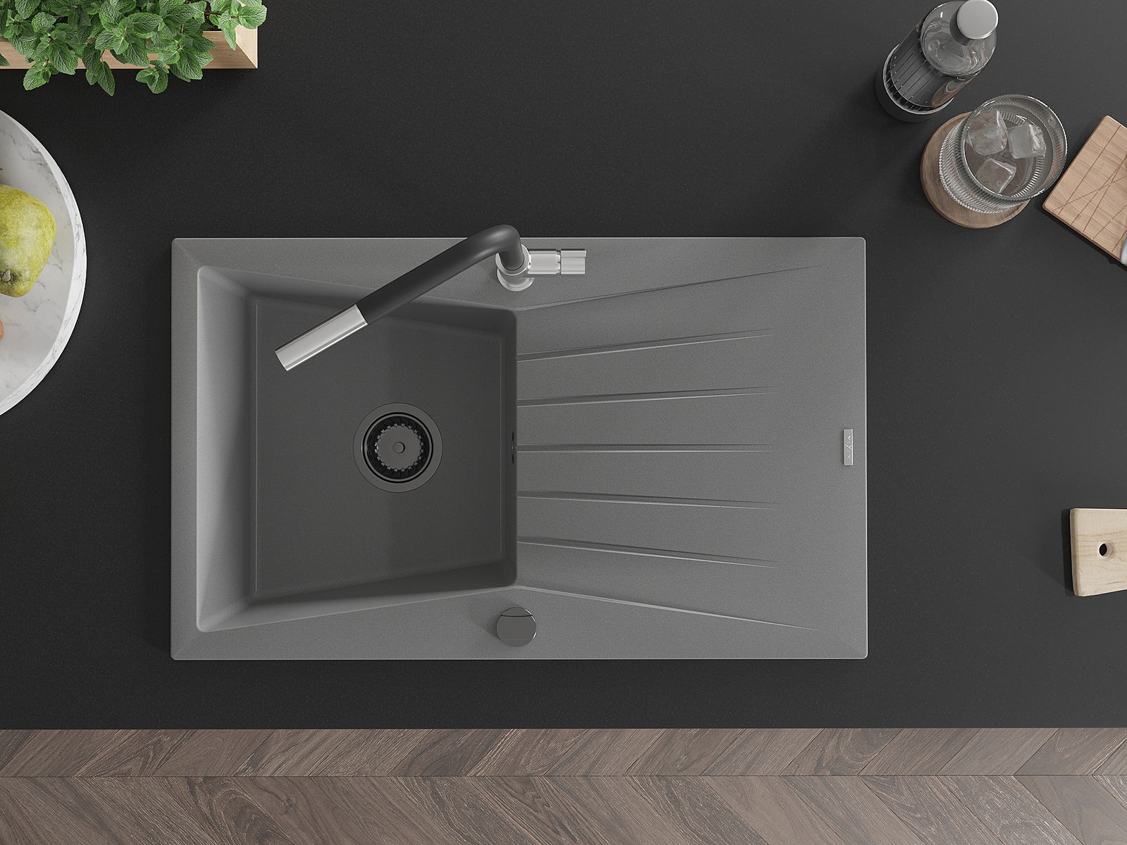 Mexen Cesar granieten spoelbak 1-komerig met afdruiprek en keukenkraan Flora, grijs - 6514-71-670401-07-B