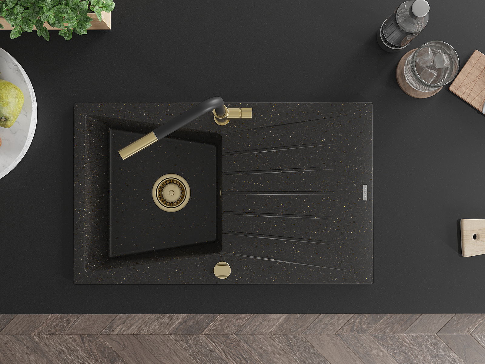 Mexen Cesar granieten spoelbak 1-vergiet met afdruiprek en keukenmengkraan Flora, zwart/goud metallic - 6514-75-670401-57-G