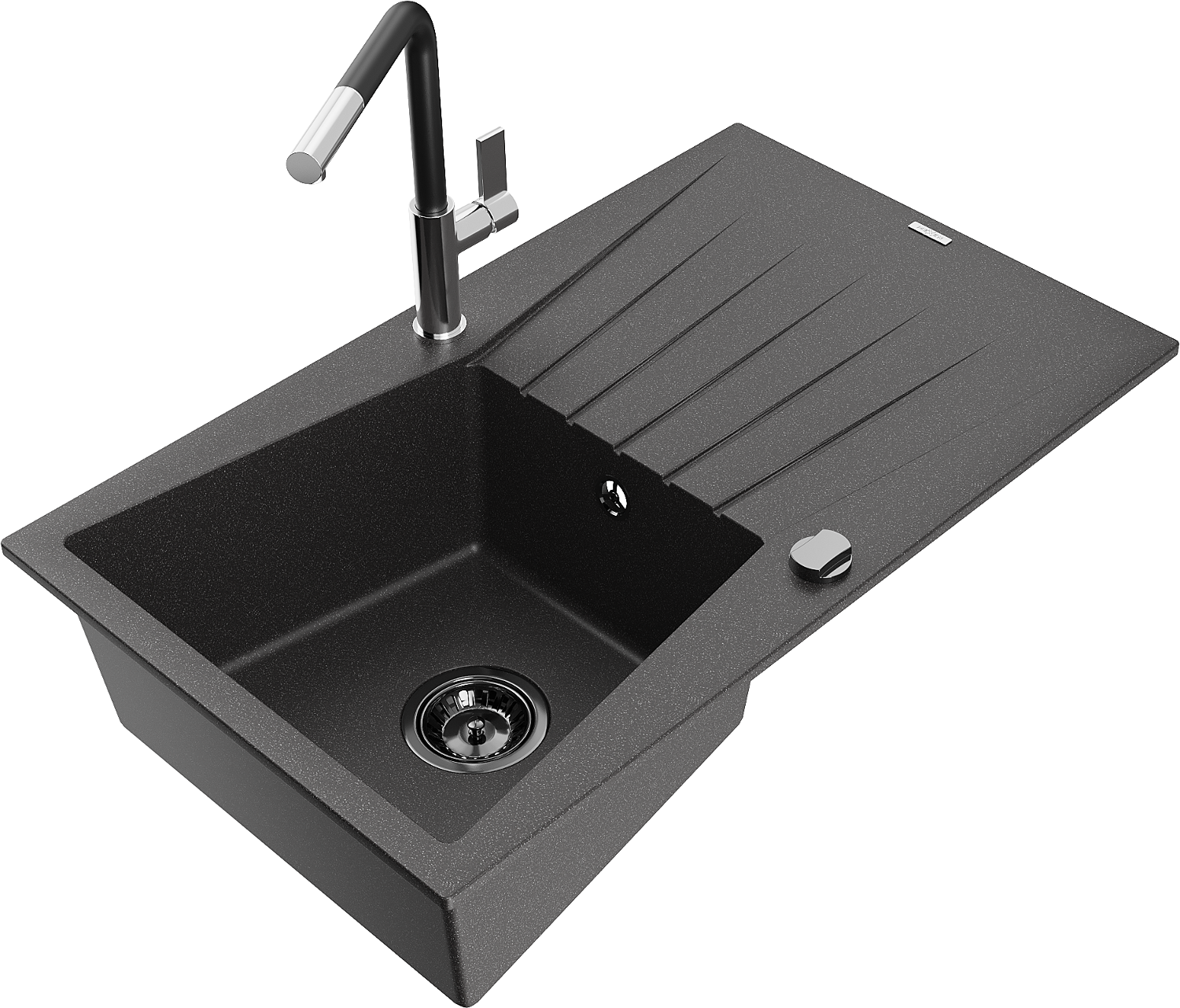 Mexen Cesar granieten gootsteen 1-kompartment met afdruiprek en keukenkraan Flora, zwart gespikkeld - 6514-76-670401-07-B