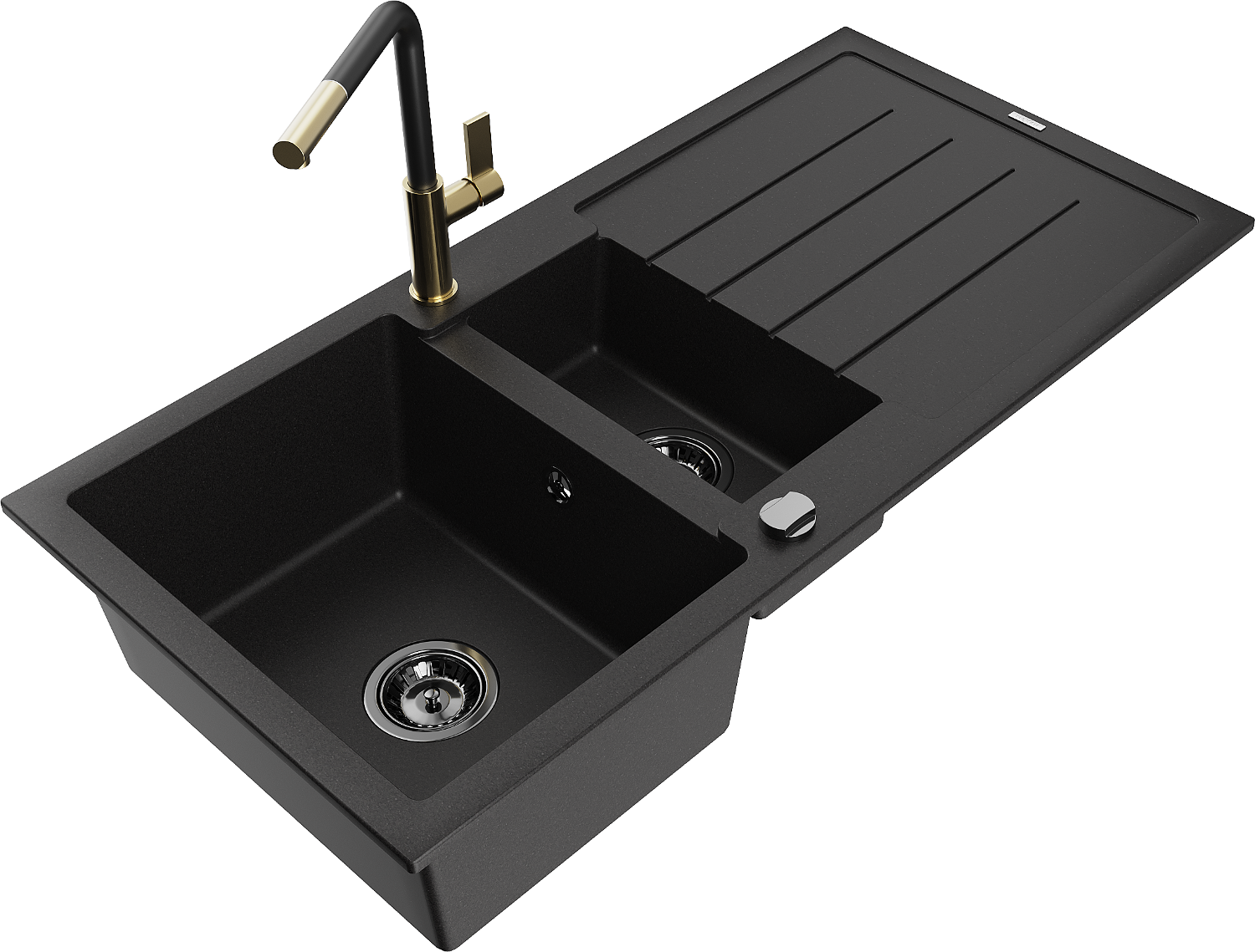 Mexen Andres granieten spoelbak 1,5-komor met afdruiprek en keukenkraan Flora, zwart - 6515-77-670401-57-B