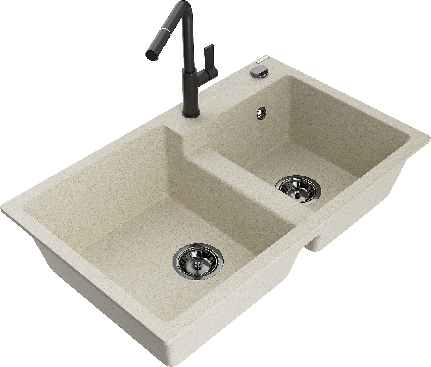 Mexen Tomas granieten gootsteen 2-kamer met keukenmengkraan Flora, beige - 6516-69-670401-70-B