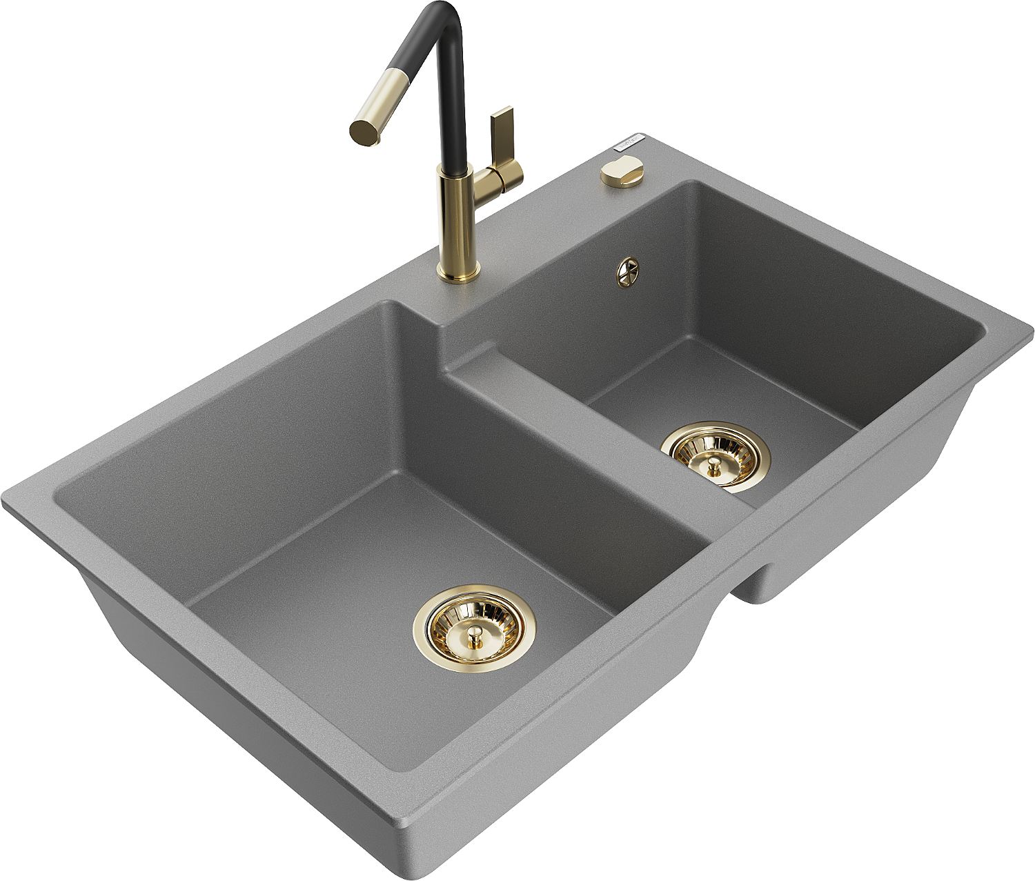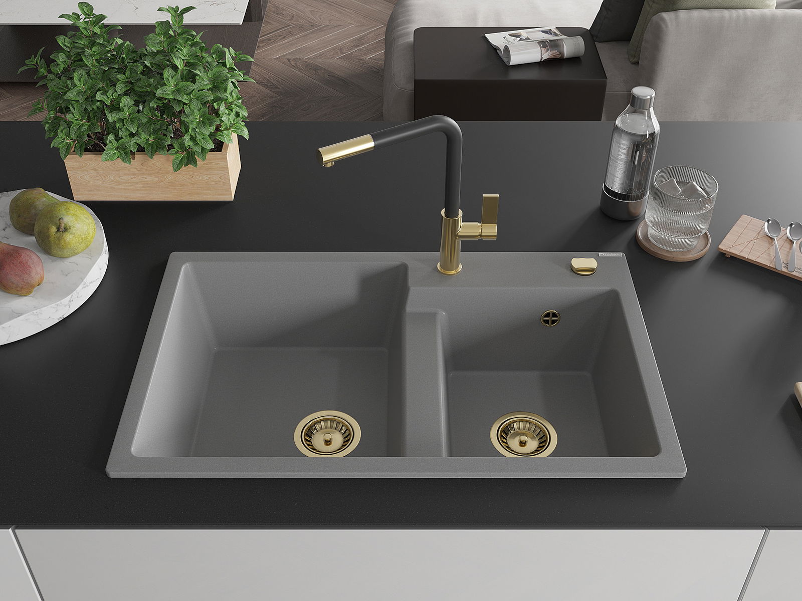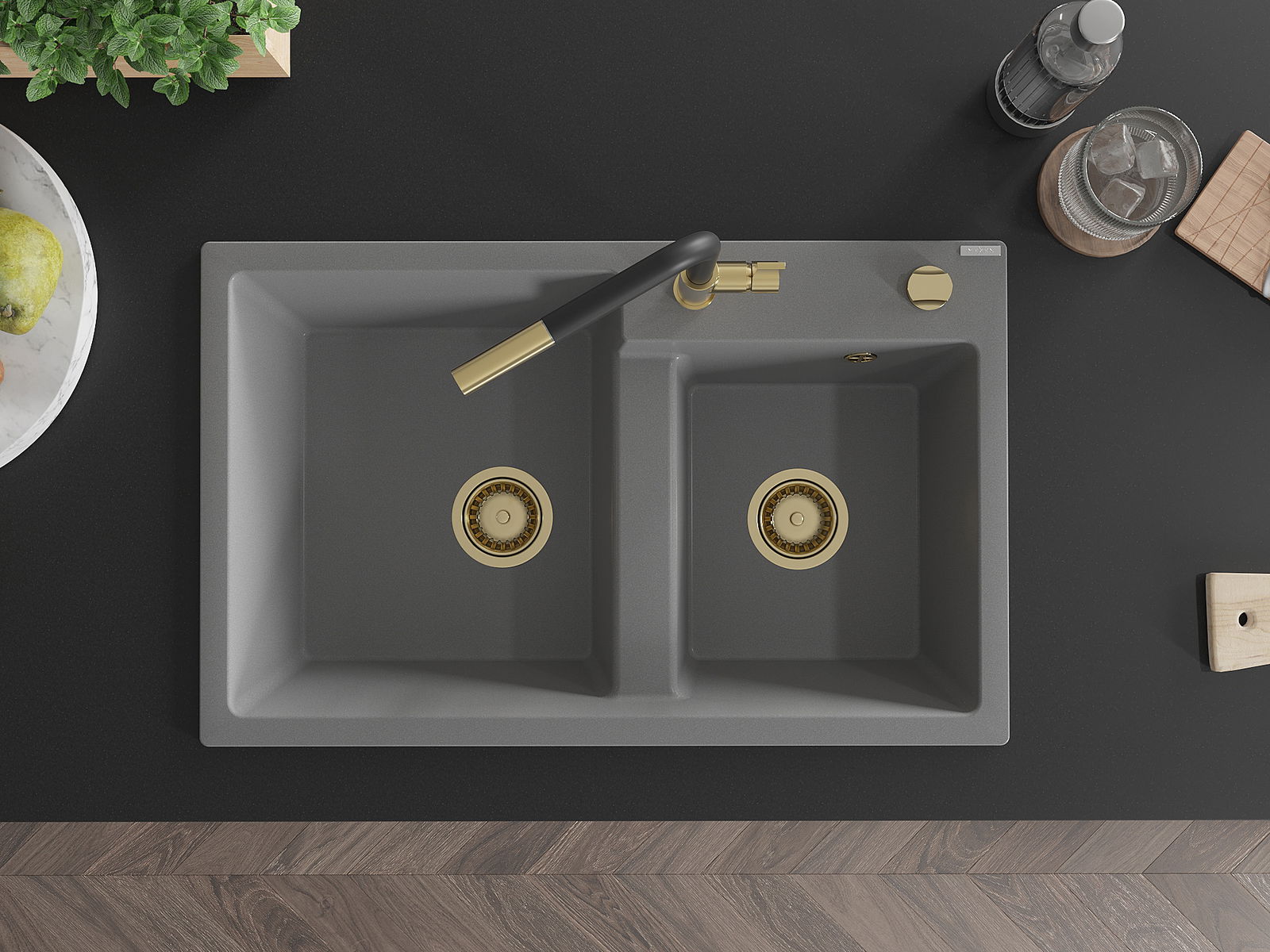 Mexen Tomas granieten gootsteen met 2 kommen en keukenkraan Flora, grijs - 6516-71-670401-57-G
