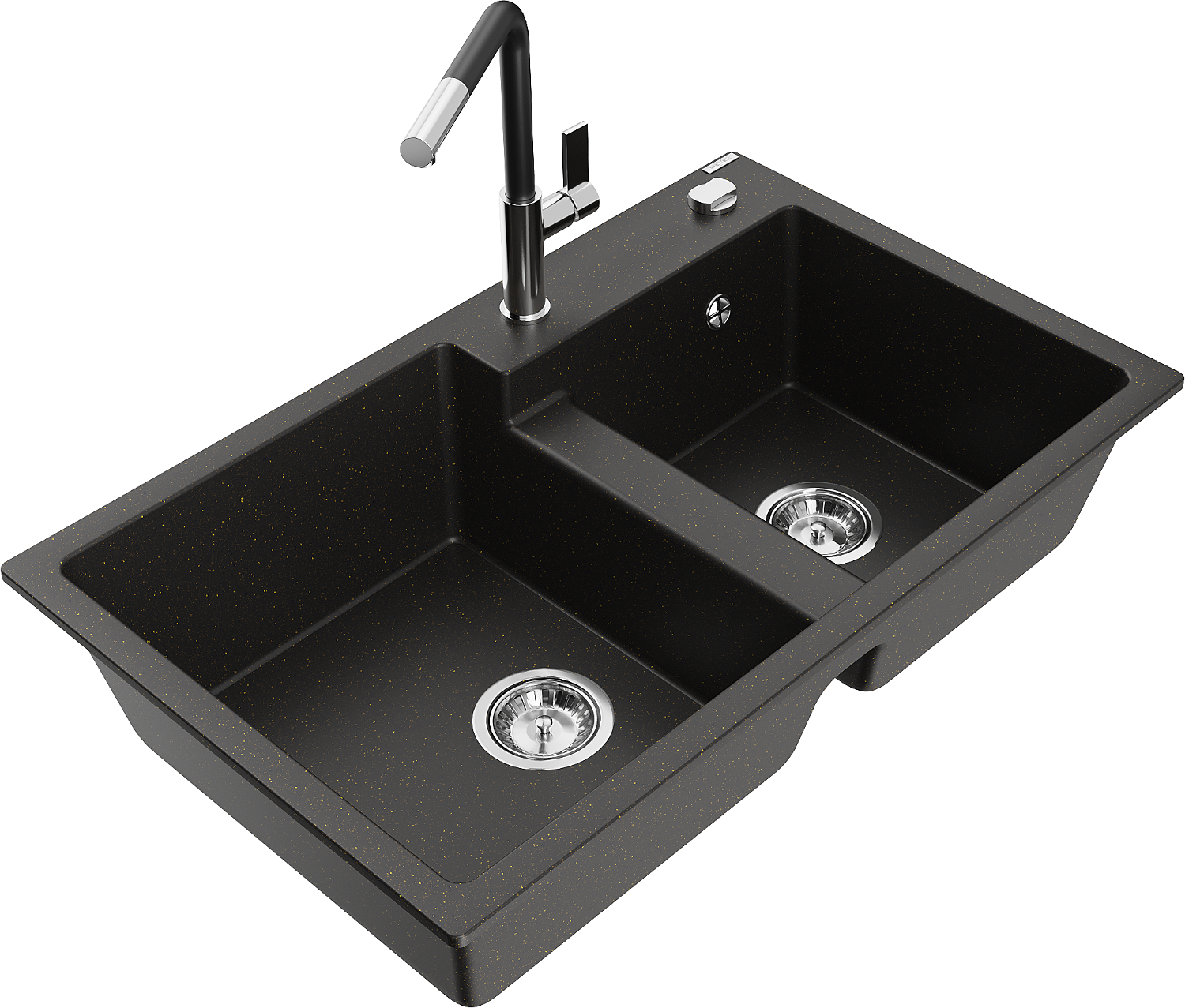 Mexen Tomas granieten gootsteen 2-kamer met keukenmengkraan Flora, zwart/goud metallic - 6516-75-670401-07