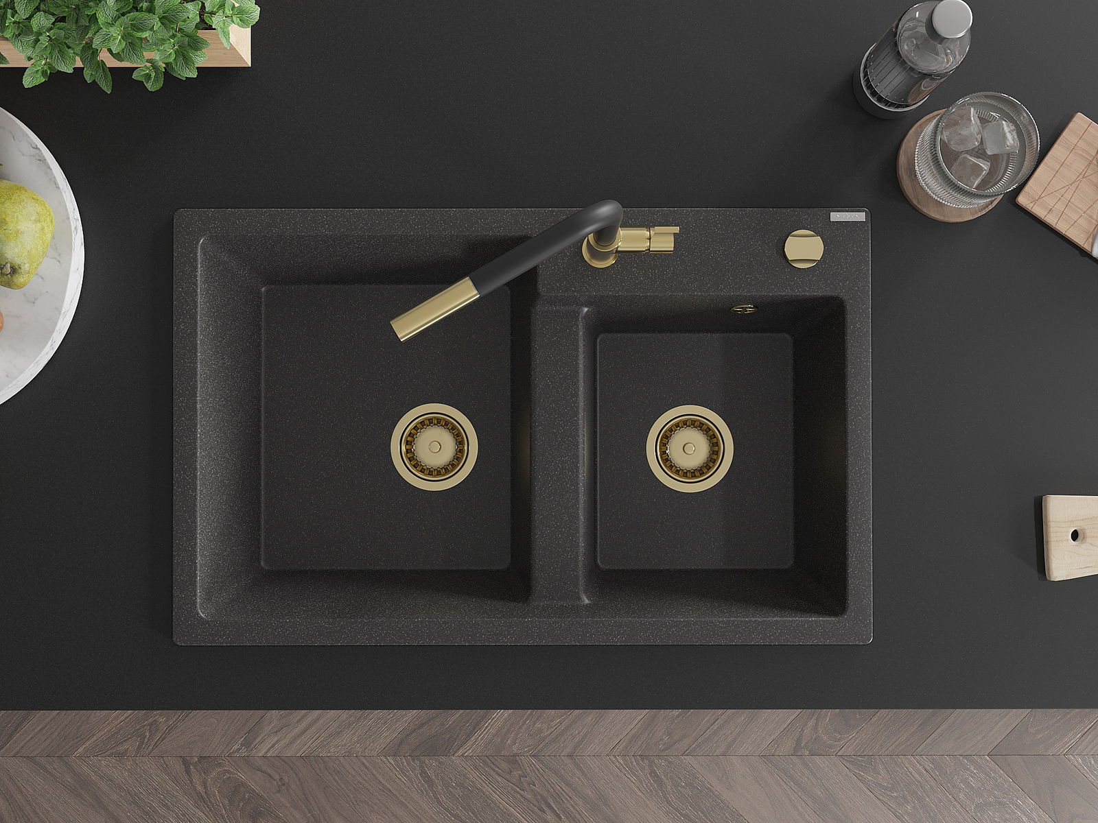 Mexen Tomas granieten gootsteen 2-kamers met keukenmengkraan Flora, zwart gespikkeld - 6516-76-670401-57-G