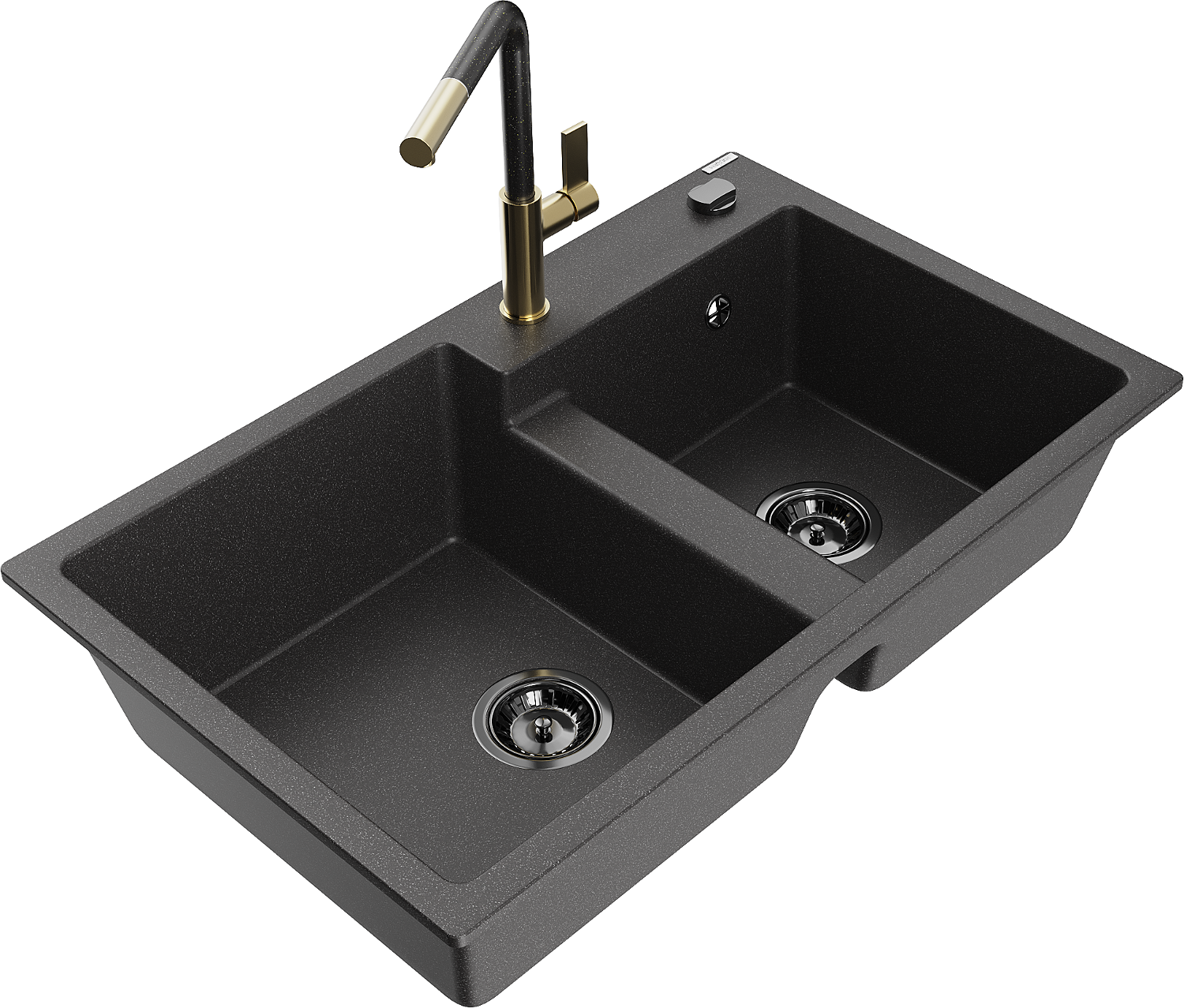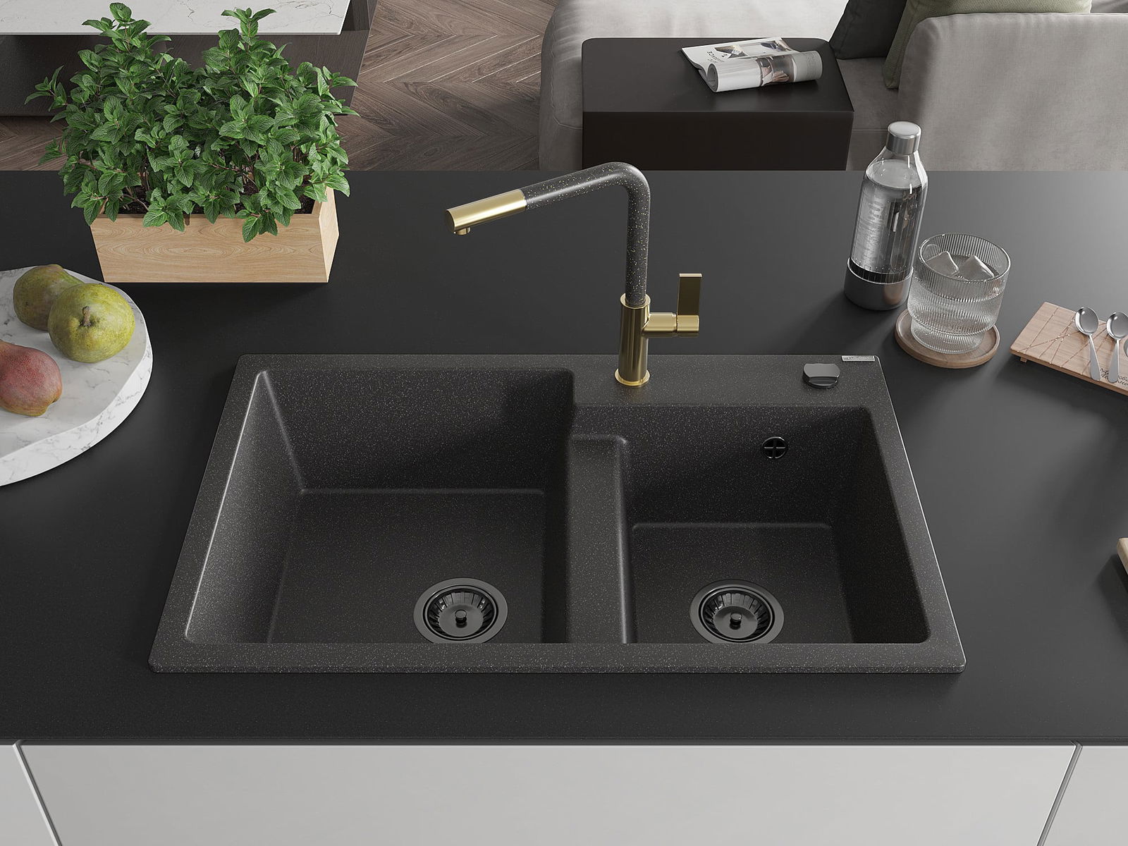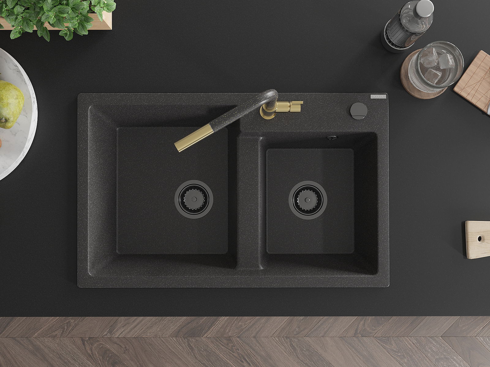 Mexen Tomas granieten gootsteen met 2 kamers en keukenkraan Flora, zwart gespikkeld - 6516-76-670401-75-B