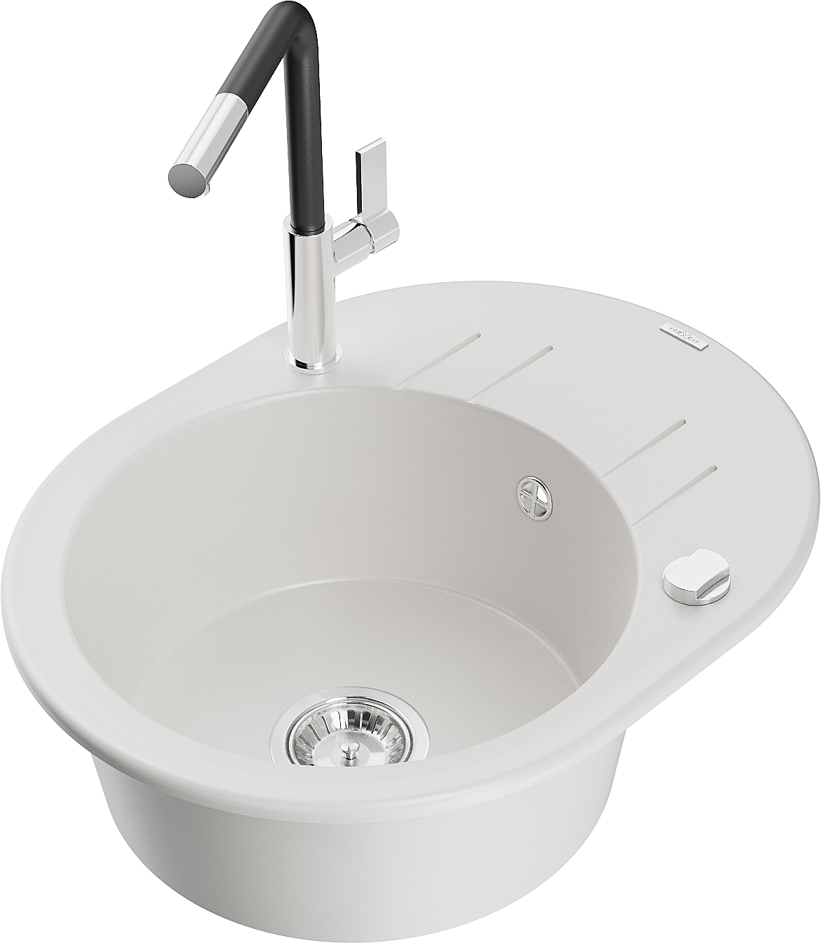 Mexen Kevin granieten keukenafvoer 1-kompartiment met afdruiprek en keukenmengkraan Flora, wit - 6517-20-670401-07