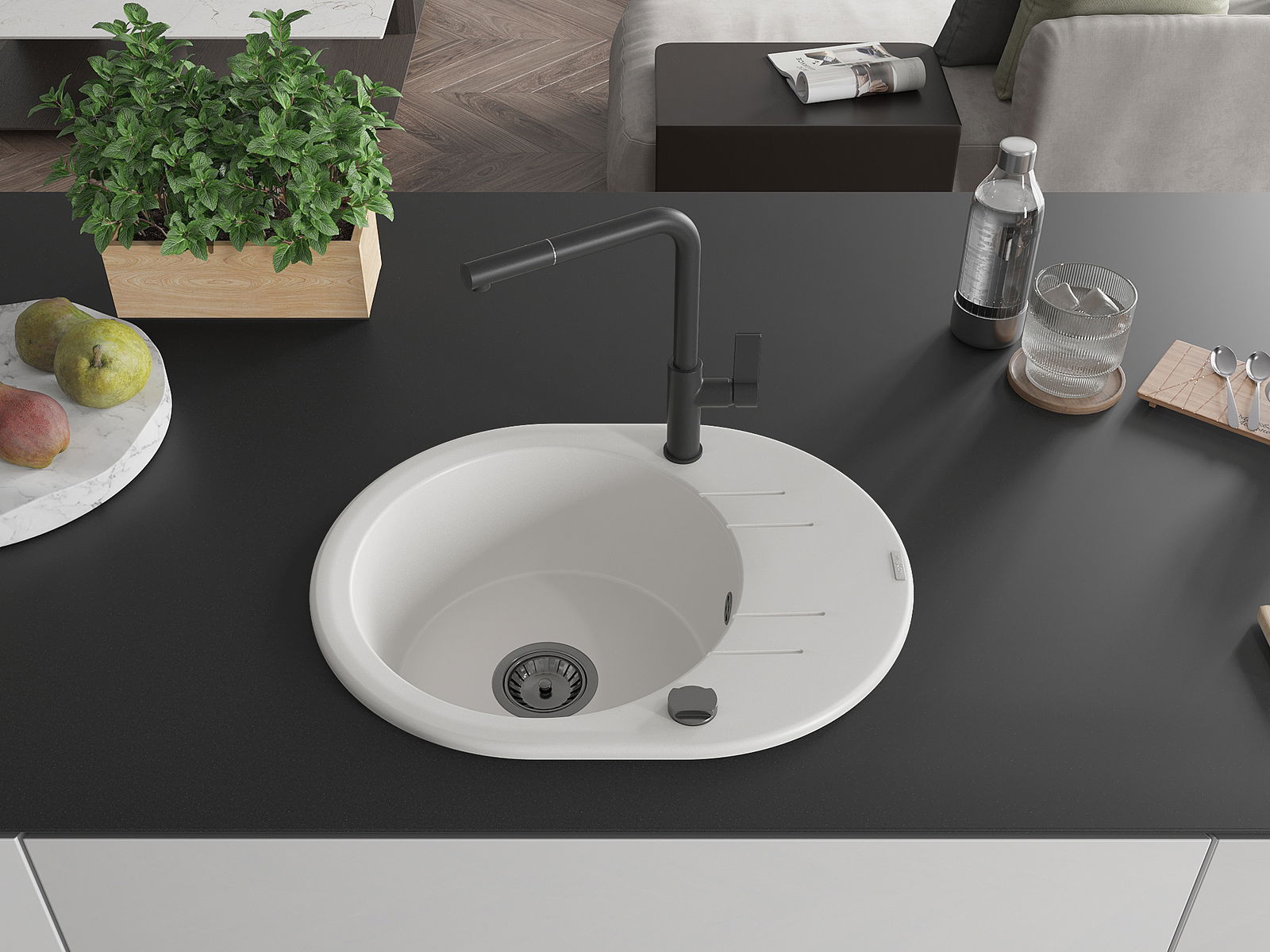 Mexen Kevin granieten gootsteen 1-kompartment met afdruiprek en keukenkraan Flora, wit - 6517-20-670401-70-B