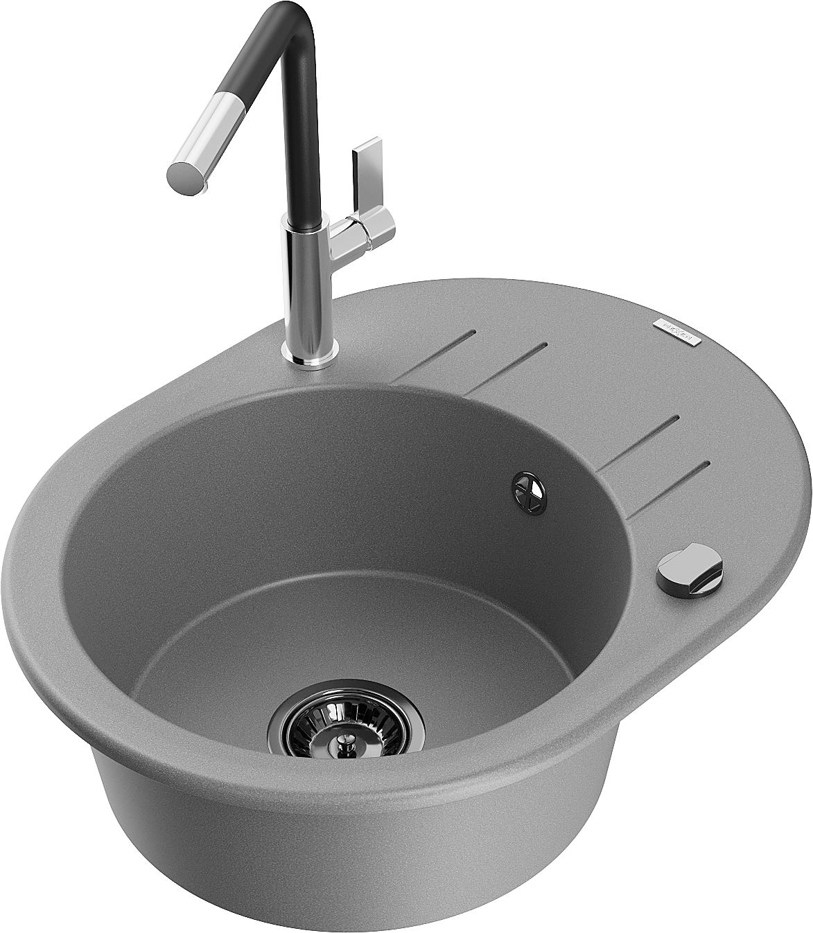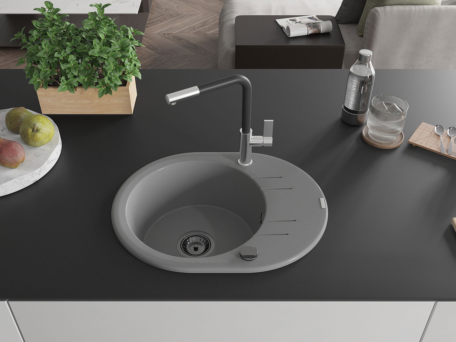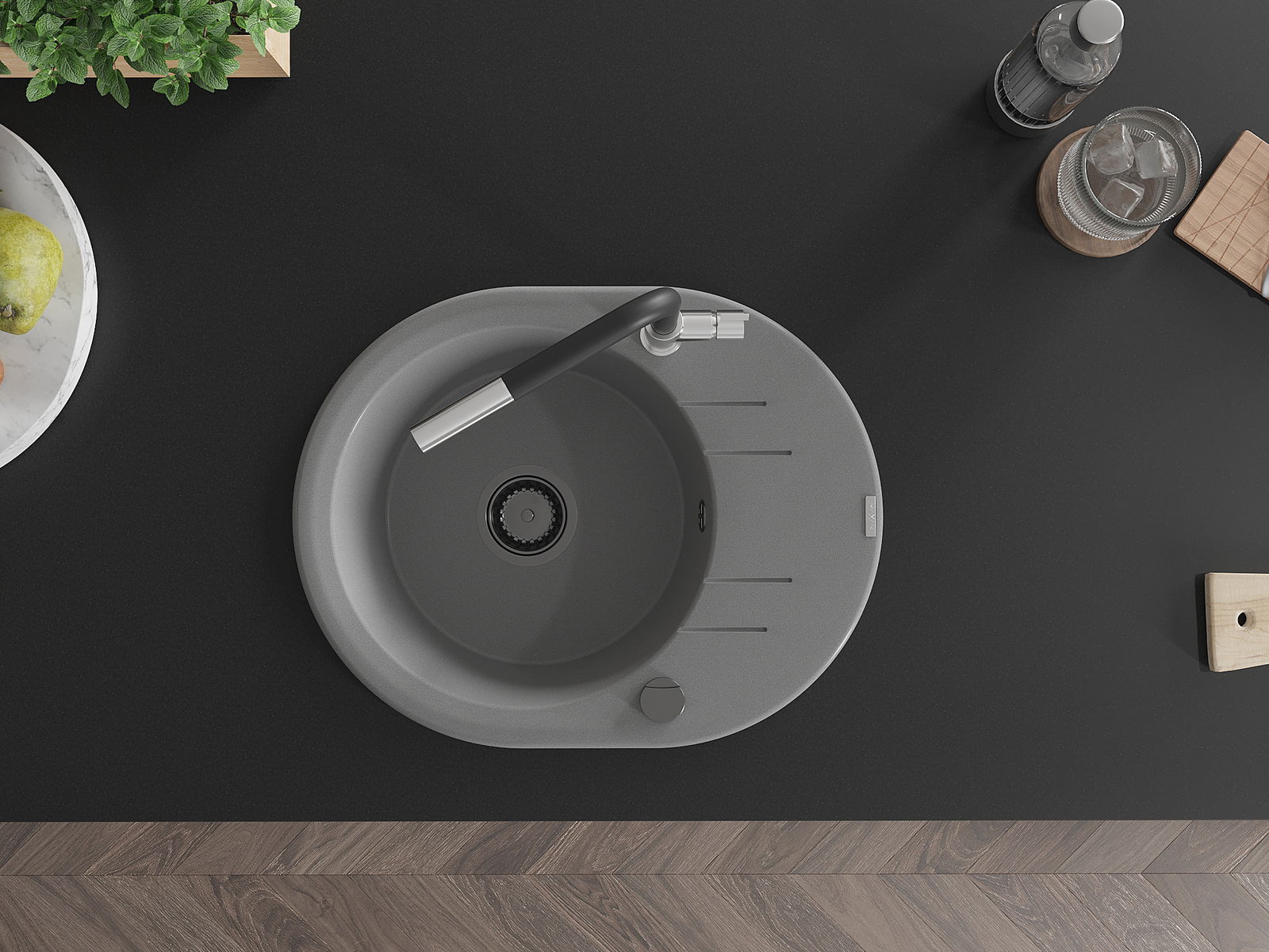 Mexen Kevin granieten spoelbak 1-komps met afdruiprek en keukenkraan Flora, grijs - 6517-71-670401-07-B