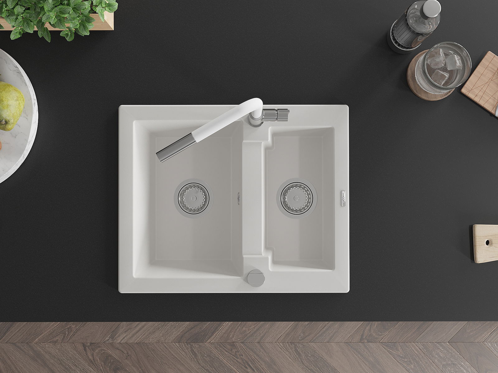 Mexen Carlos granieten gootsteen 1,5-kuip met keukenkraan Flora, wit - 6518-20-670401-02