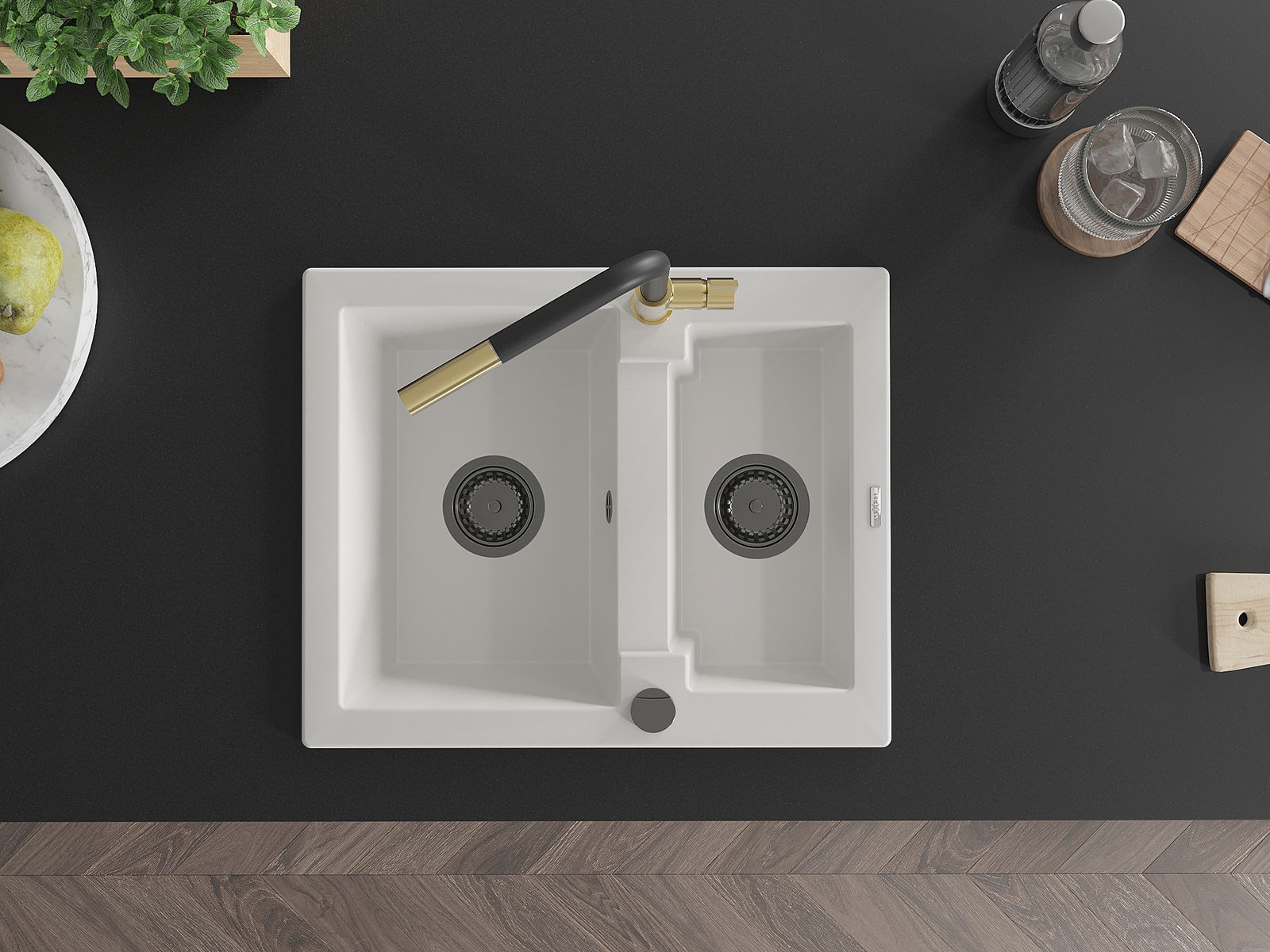 Mexen Carlos granieten gootsteen 1,5-kamer met keukenkraan Flora, wit - 6518-20-670401-57-B