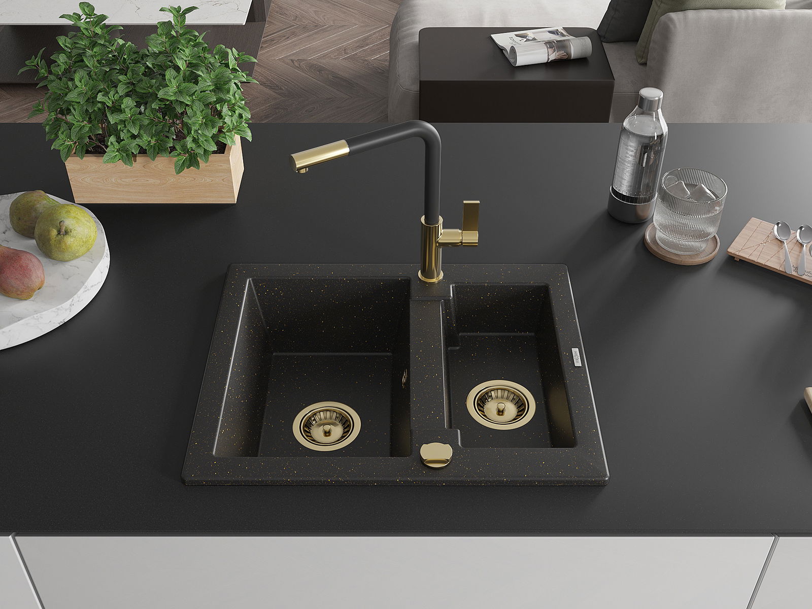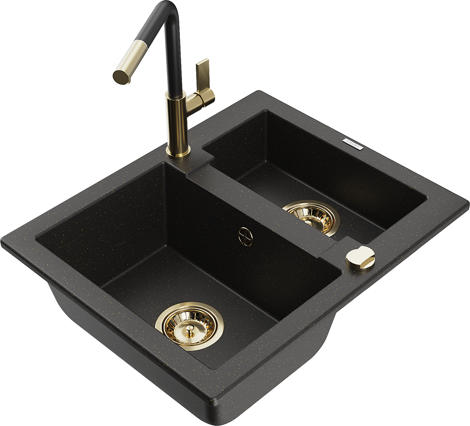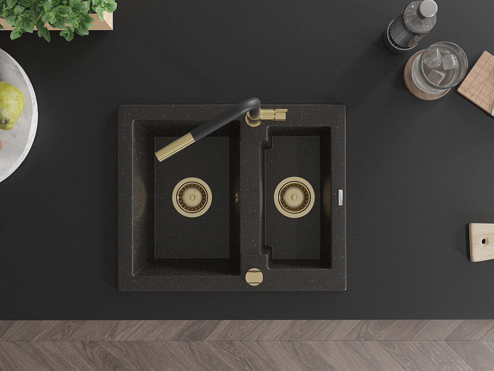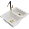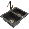 Mexen Carlos granieten spoelbak 1,5-baks met keukenmengkraan Flora, zwart/goud metallic - 6518-75-670401-57-G