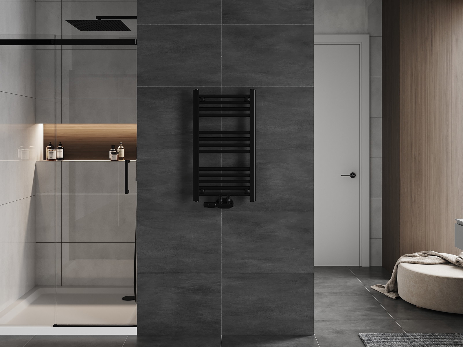 Mexen Mars is een moderne badkamerradiator met afmetingen van 700 x 400 mm en een vermogen van 238 W, ideaal voor elke badkamer. Zijn elegante zwarte kleur (RAL 9005) en stalen constructie garanderen duurzaamheid en stijl op het hoogste niveau. De radiator kan worden aangesloten via een onderaansluiting (35 cm) of middenaansluiting (5 cm) en is geschikt voor het installeren van een verwarmingselement. Dankzij de corrosiebestendige laklaag en brandreactieklasse A1 biedt het product veiligheid in gebruik. De maximale werkingstemperatuur is 95 °C en de werkdruk is 0,6 Mpa. De set bevat ophangingen, montagemateriaal, afsluitdoppen en een ontluchter.