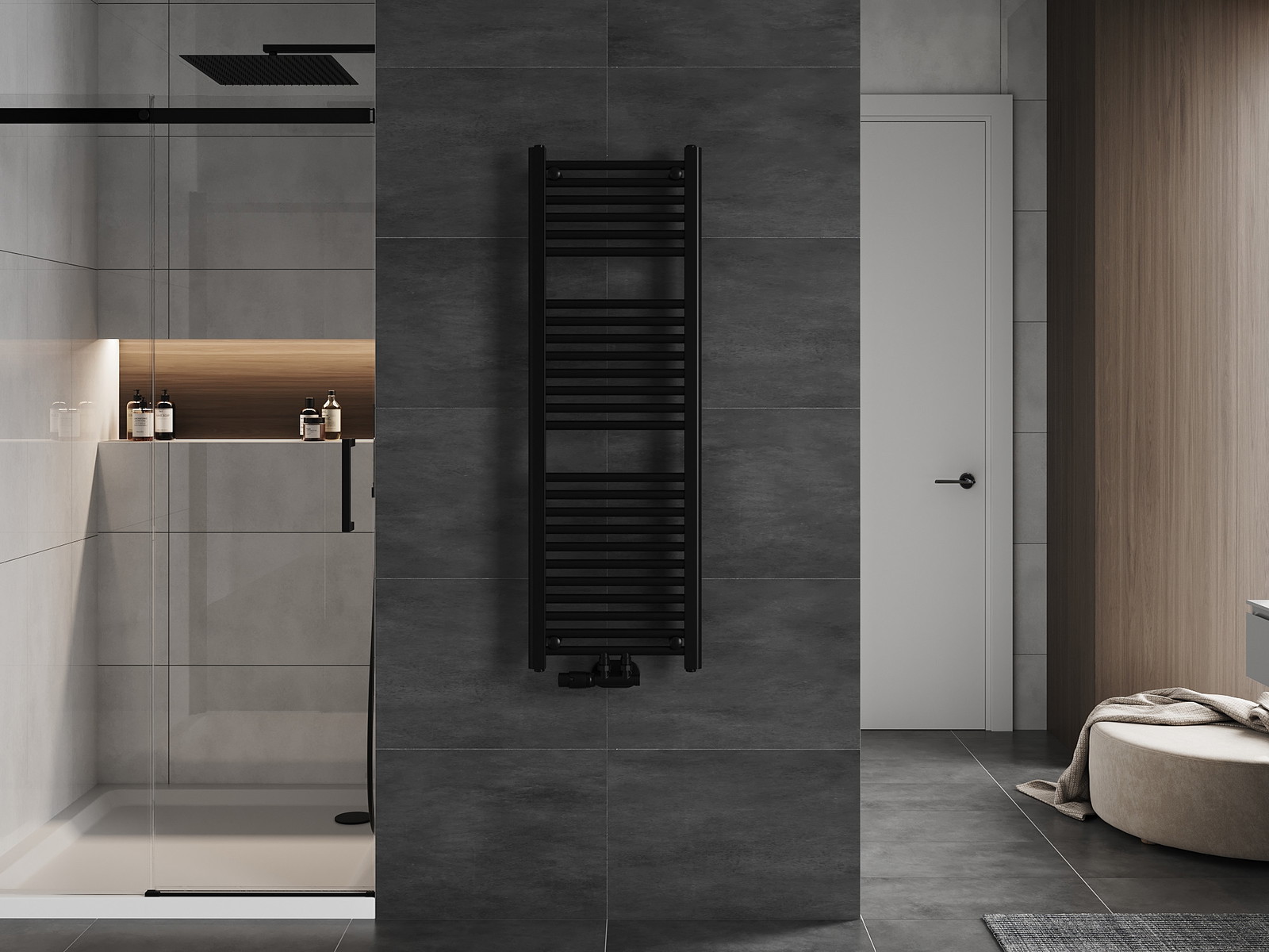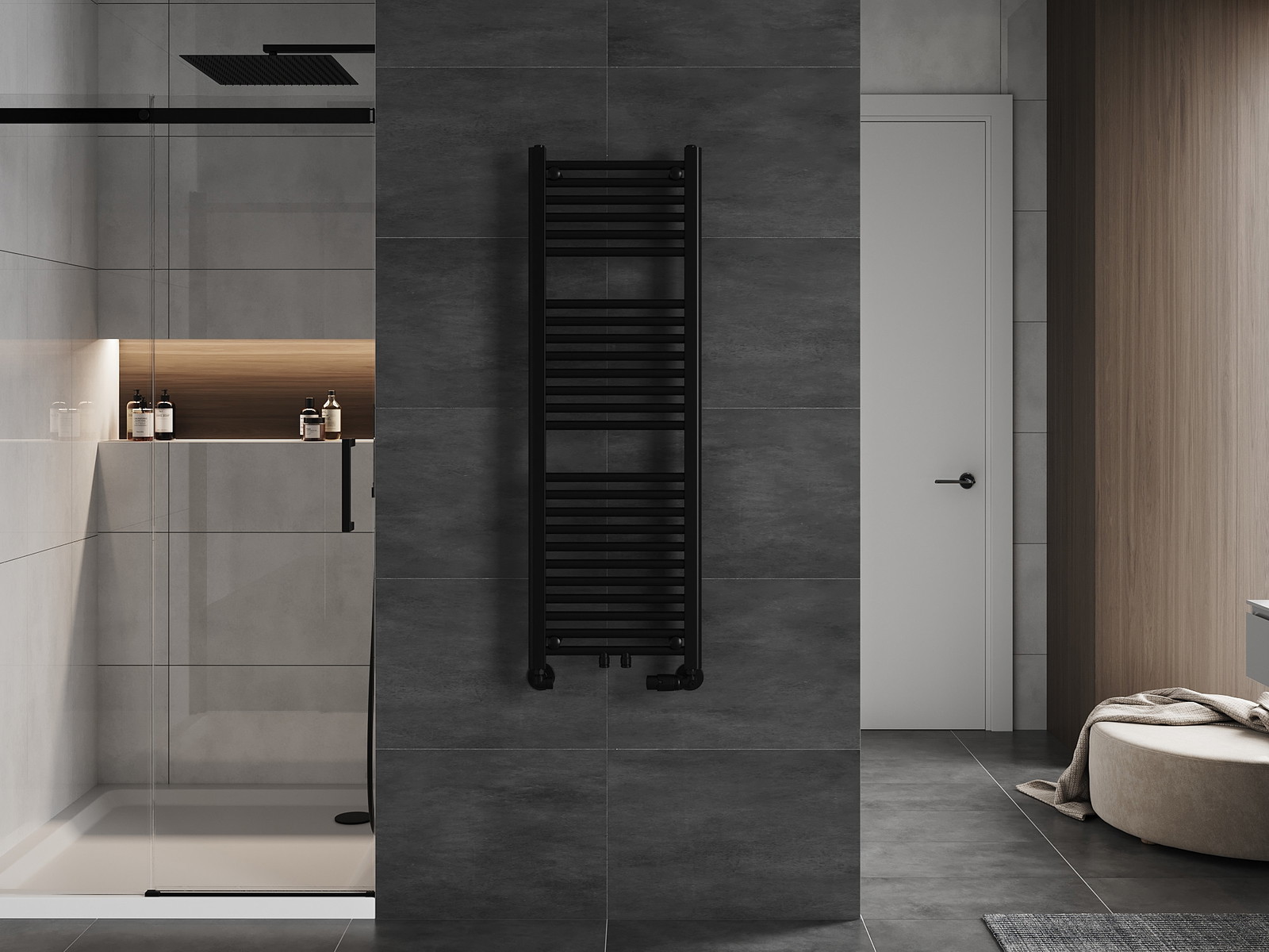 De Mexen Mars badkamerradiator is de ideale oplossing om thermisch comfort in uw badkamer te verzekeren. De afmetingen van 1200 x 400 mm en een vermogen van 439 W gaan perfect samen met de elegante zwarte kleur RAL 9005. Gemaakt van hoogwaardig staal, gekenmerkt door corrosiebestendigheid dankzij de duurzame laklaag. Biedt verschillende aansluitopties en de mogelijkheid om een verwarmingselement te monteren, wat de functionaliteit vergroot. Daarnaast heeft het een A1-certificaat voor brandreactie en kan het werken bij hoge temperaturen tot 95 °C.