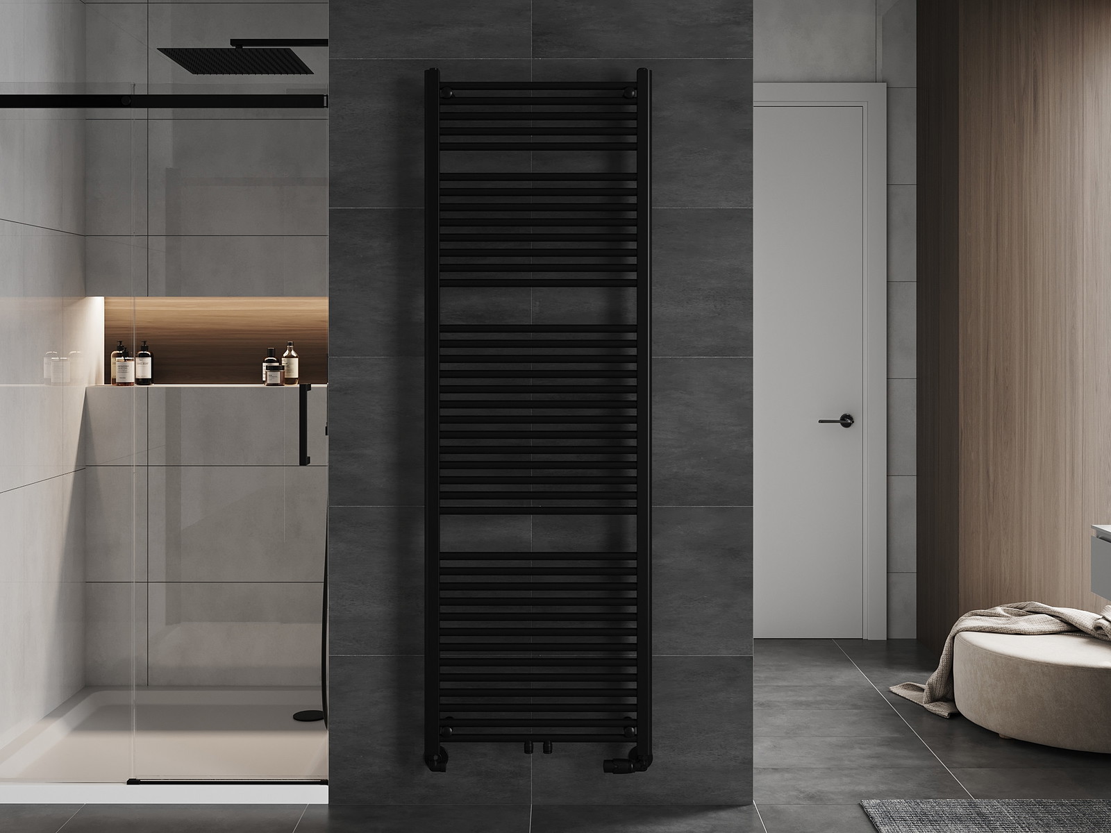 Mexen Mars is een moderne badkamerradiator die indruk maakt met zijn moderne design en functionaliteit. De afmetingen van 1800 x 600 mm maken hem ideaal voor grotere badkamers en het verwarmingsvermogen van 953 W verwarmt de ruimte effectief. Gemaakt van duurzaam staal en geschilderd in een elegante zwarte kleur (RAL 9005), is hij bestand tegen corrosie. De mogelijkheid tot installatie van een verwarmer en verschillende aansluitopties bieden veelzijdig gebruiksgemak. De set bevat ophangbeugels en een montagekit, wat de installatie vergemakkelijkt.