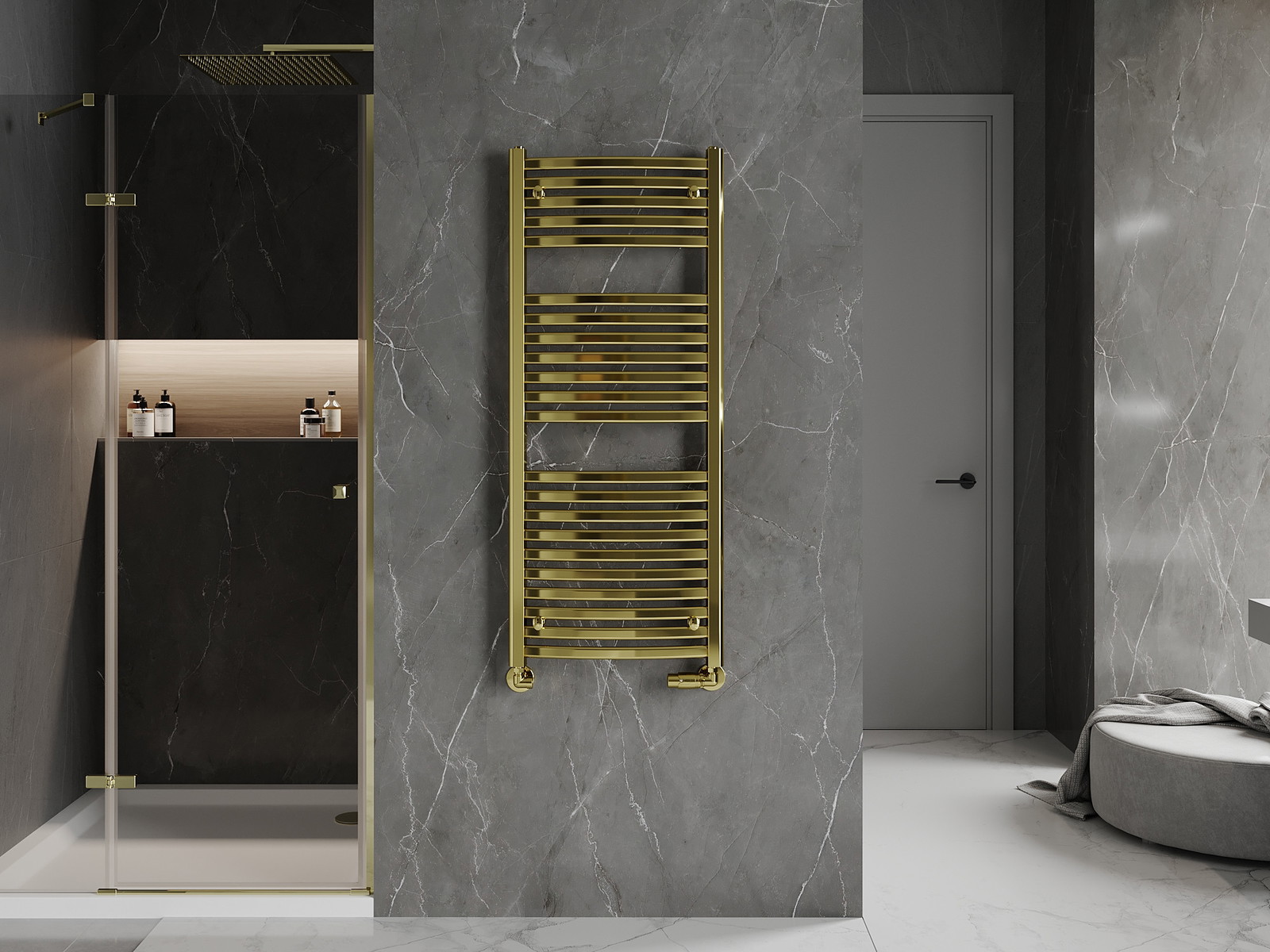 Mexen Helios is een luxe badkamerradiator met afmetingen van 1200 x 500 mm en een unieke gouden kleur, die elegantie toevoegt aan elke badkamer. Gemaakt van staal, kenmerkt het zich niet alleen door zijn stijlvolle uiterlijk, maar ook door hoge duurzaamheid en corrosiebestendigheid dankzij een speciale verflaag. Het heeft een verwarmingsvermogen van 448 W, wat zorgt voor optimale verwarming. Uitgerust met 4 ½" aansluitingen en een optie voor het monteren van een verwarmingselement, biedt het flexibiliteit qua installatie. Alle noodzakelijke montagematerialen zijn inbegrepen.