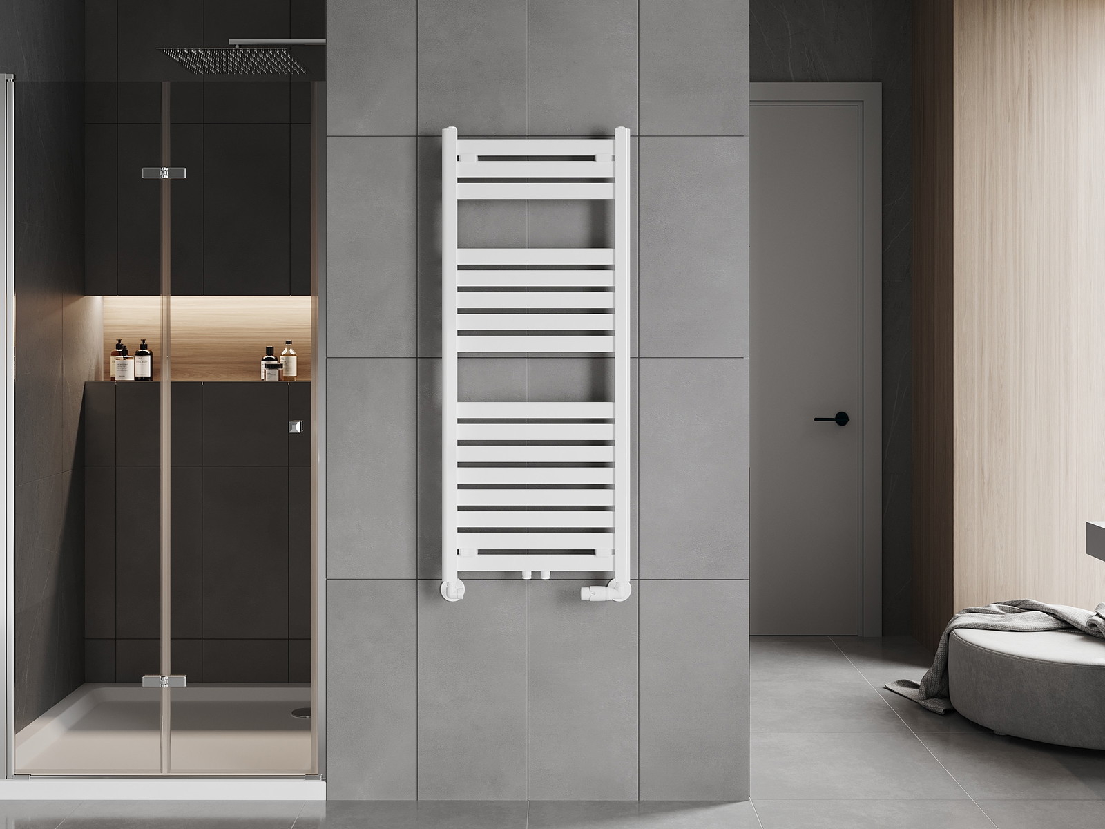 Mexen Uran is een moderne badkamerradiator met afmetingen van 1200 x 500 mm, ideaal voor elke badkamer. Dankzij het vermogen van 534 W zorgt het voor efficiënte verwarming. Het product is gemaakt van hoogwaardig staal, geschilderd in de kleur wit RAL 9016, bestand tegen corrosie. De radiator heeft universele aansluitingen: 2xG ½″ midden en 4xG ½″ van boven en onder, wat de installatie vergemakkelijkt. Kan worden gebruikt bij een maximale werkdruk van 0,4 Mpa en een temp. van 95 °C. Alle montage-elementen zijn inbegrepen.