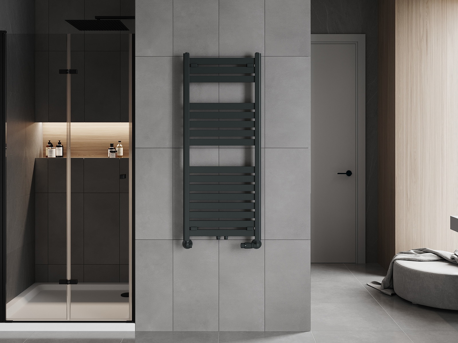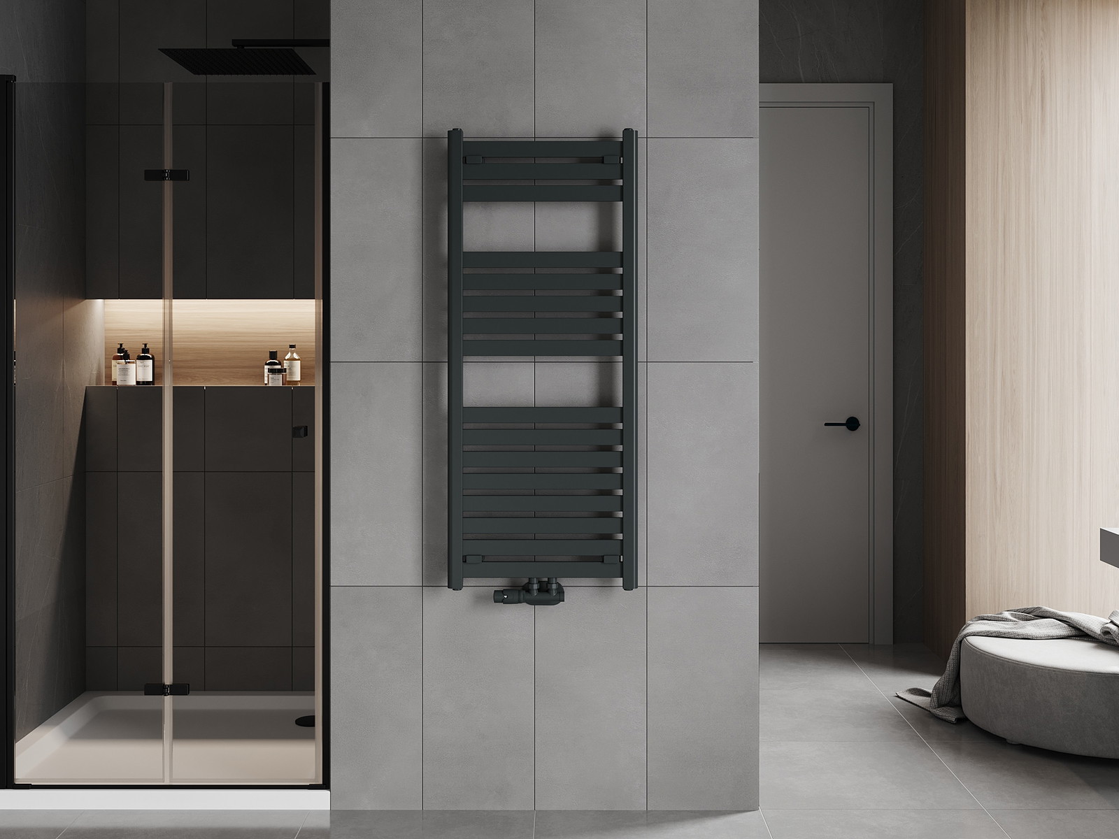 De Mexen Uran badkamerradiator is de ideale oplossing voor uw huis. Dankzij de afmetingen 1200 x 500 mm en het verwarmingsvermogen van 534 W zorgt het voor optimale verwarming van de ruimte. Gemaakt van duurzaam staal, in antracietkleur RAL 7016, voegt het elegantie toe aan elke badkamer. Het product biedt verschillende aansluitmogelijkheden en de mogelijkheid om een verwarmingselement te monteren. De hoge kwaliteit van de laklaag garandeert weerstand tegen corrosie. Bevat een complete montagemontage, wat installatie vergemakkelijkt. Brandreactieklasse A1 en een maximale werktemperatuur van 95°C garanderen veiligheid en efficiëntie.