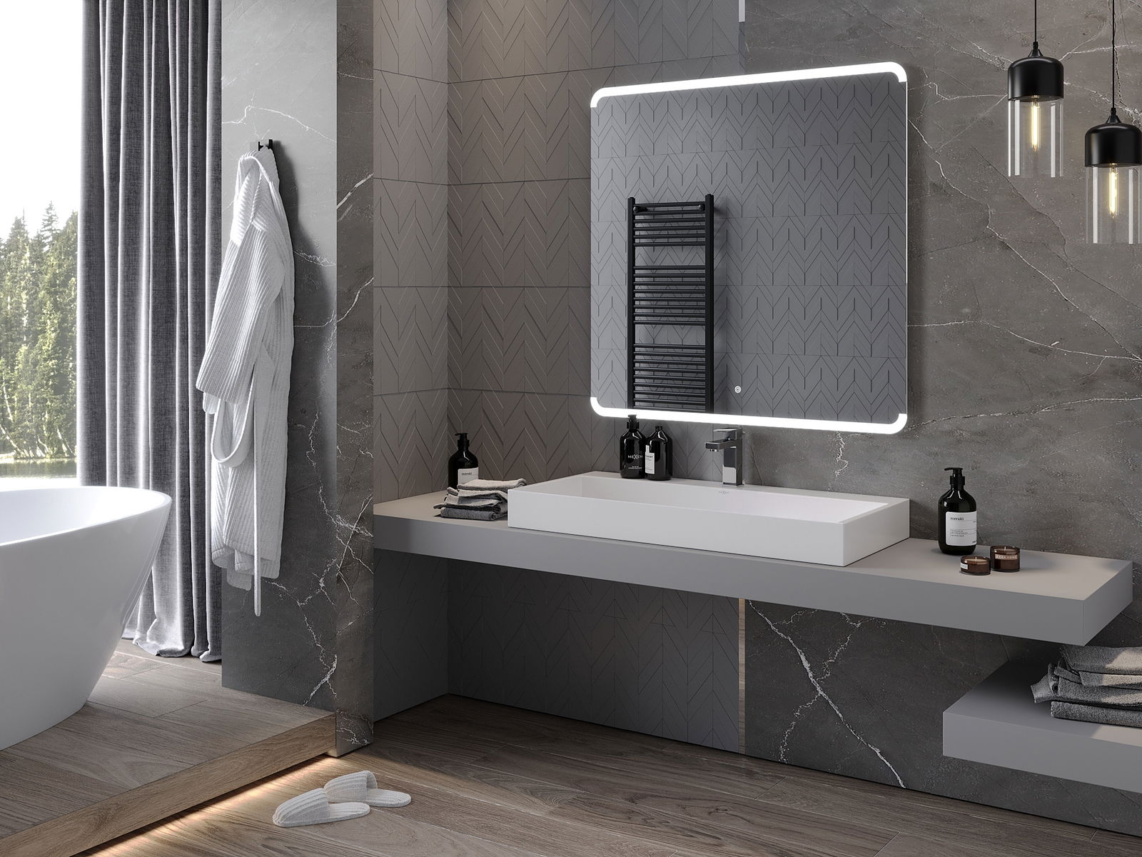 LED-verlichting bij de spiegel is een praktisch element dat het dagelijkse verzorgen vergemakkelijkt, dankzij de mogelijkheid om het gezicht perfect te verlichten. De verlichting geeft de badkamer een moderne afwerking en benadrukt de elegante inrichting ervan.