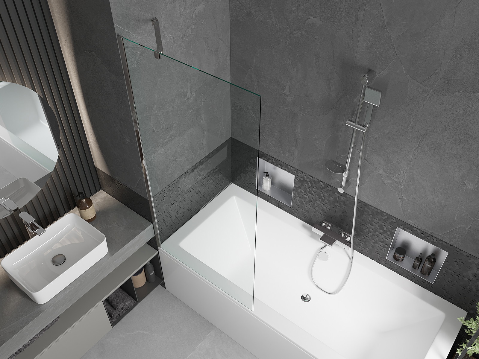 Effectieve bescherming tegen het verspreiden van water tijdens het baden. Het scherm heeft afdichtingen die perfect passen bij de glasplaat en de rand van het bad. Functionele oplossing die veiligheid en eenvoudig onderhoud garandeert.