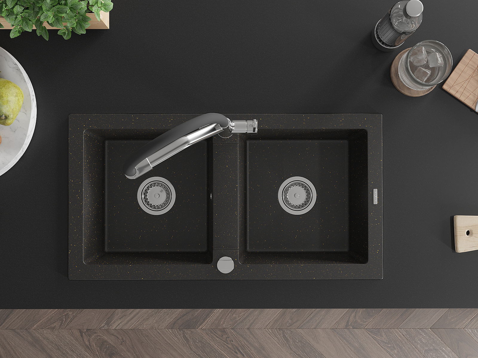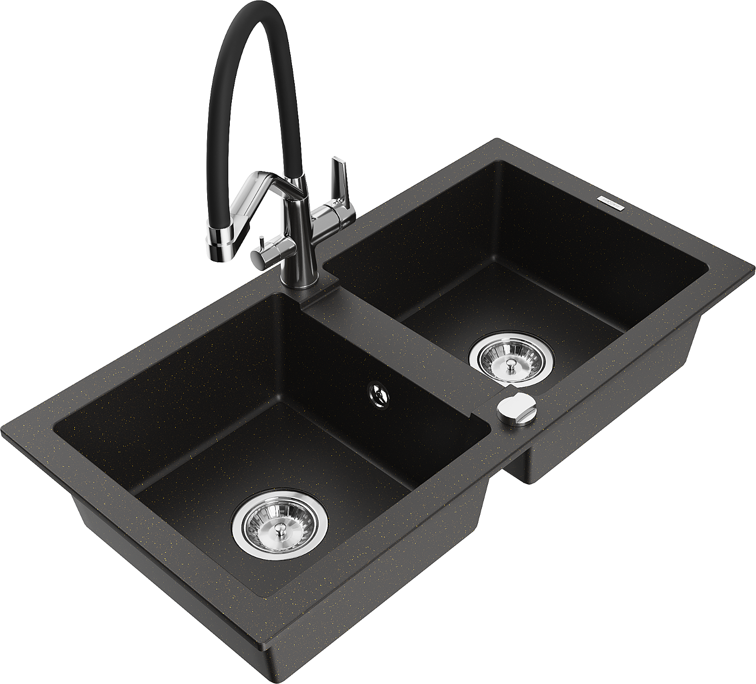 Mexen Mario granieten spoelbak 2-komoren met keukenkraan Duo, zwart/gouden metallic - 6504-75-671701-07