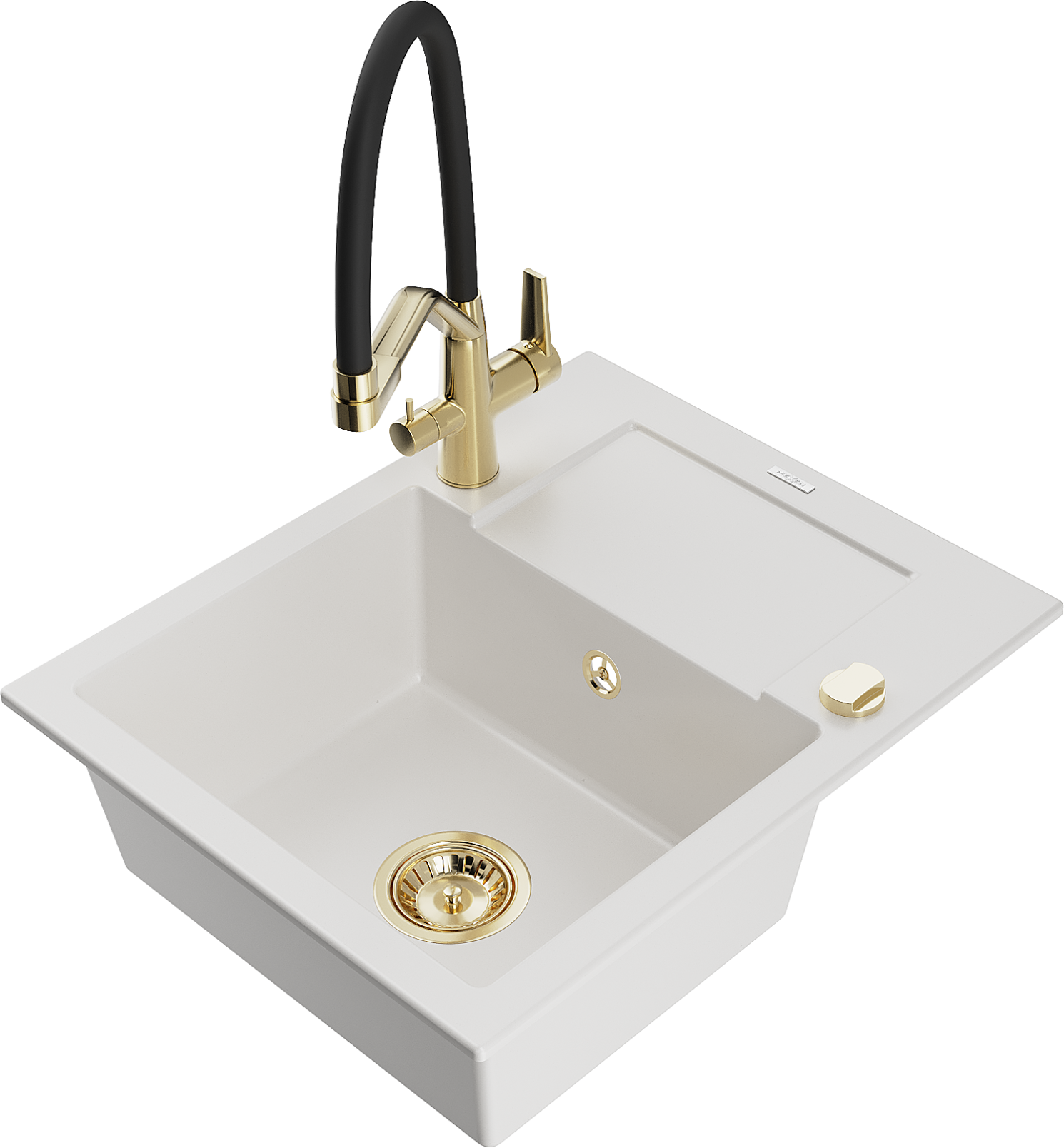 Mexen Enzo granieten spoelbak met 1 bak, afdruiprek en Duo keukenmengkraan, wit - 6506-20-671701-57-G