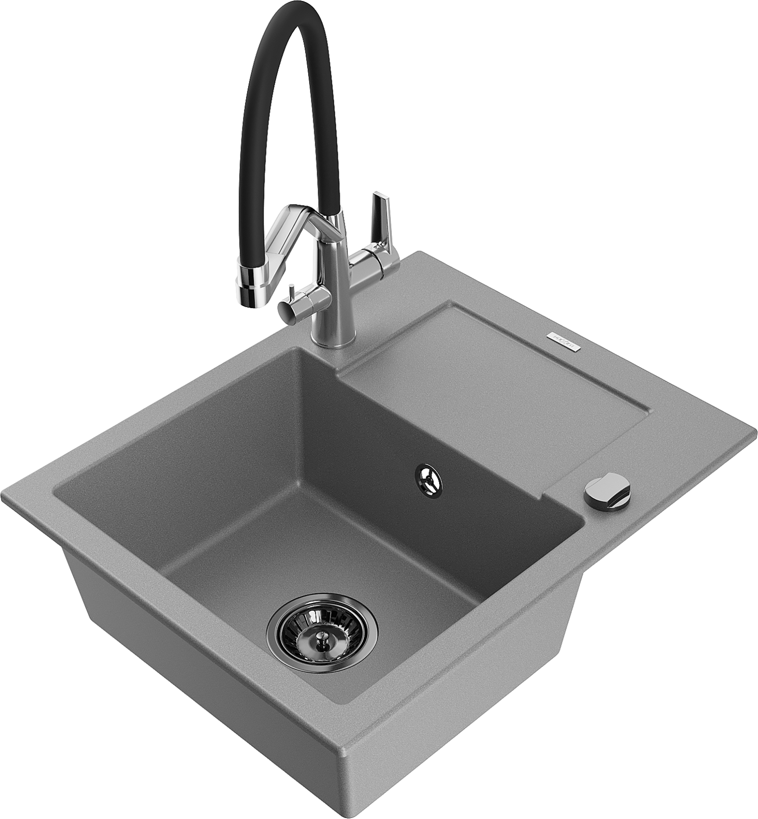 Mexen Enzo granieten gootsteen 1-komerig met afdruiprek en keukenmengkraan Duo, grijs - 6506-71-671701-07-B