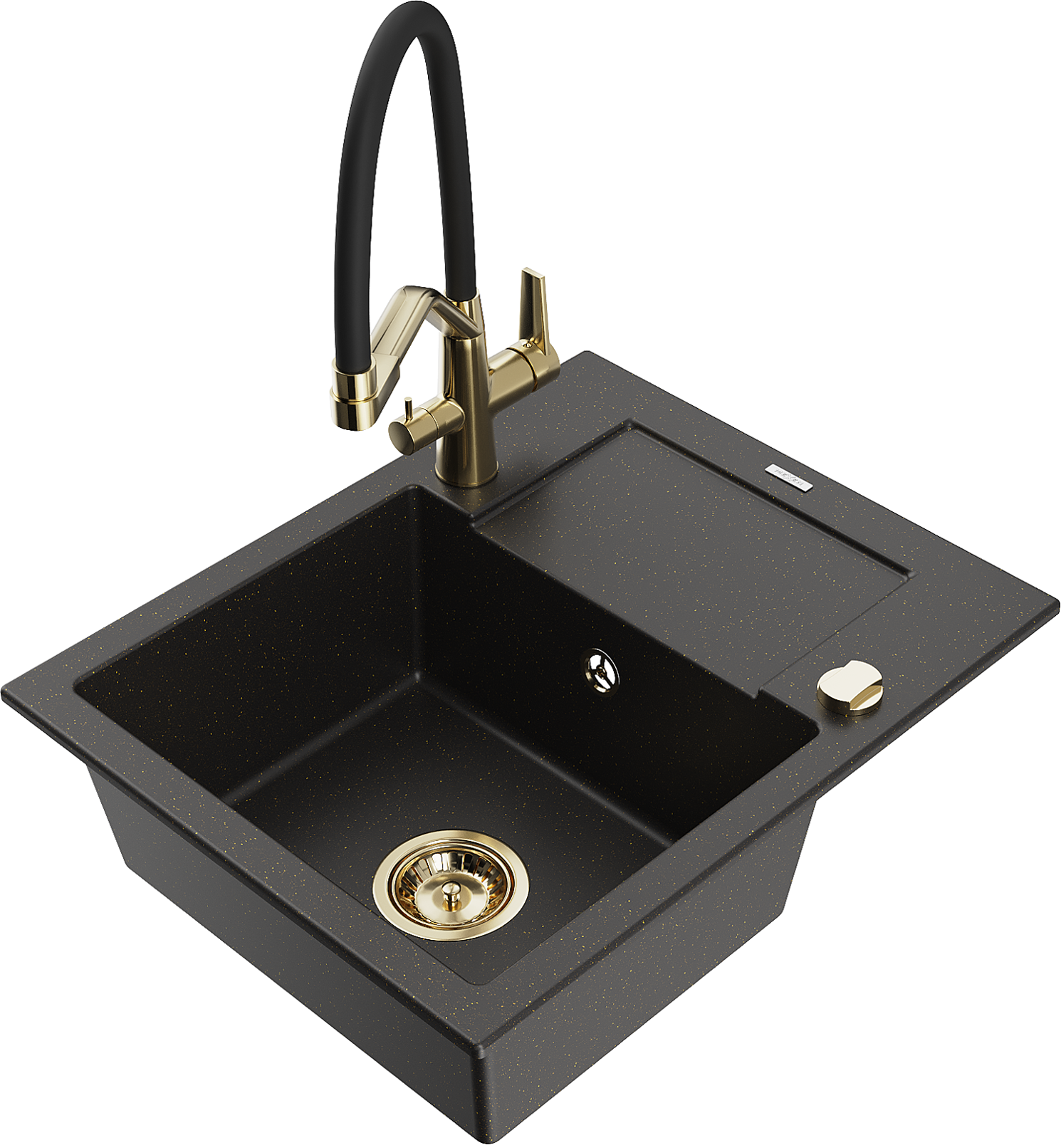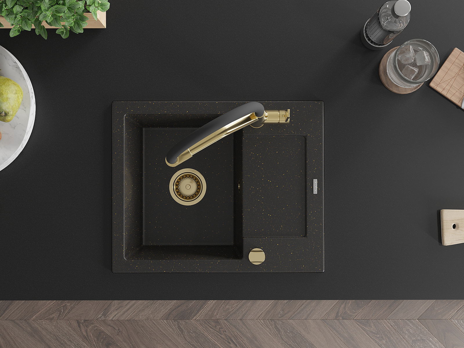 Mexen Enzo granieten gootsteen 1-kommer met afdruipgedeelte en keukenmengkraan Duo, zwart/goud metallic - 6506-75-671701-57-G
