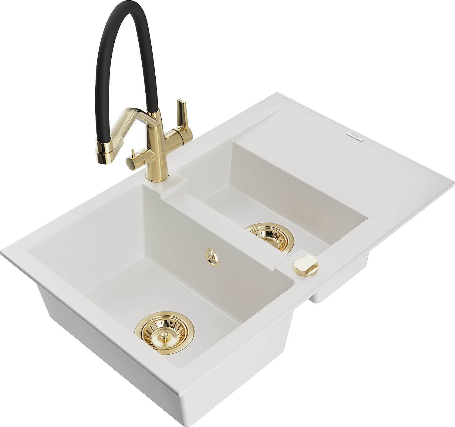 Mexen Gaspar granieten spoelbak 1,5-kamer met afdruiprek en keukenmengkraan Duo, wit - 6507-20-671701-57-G