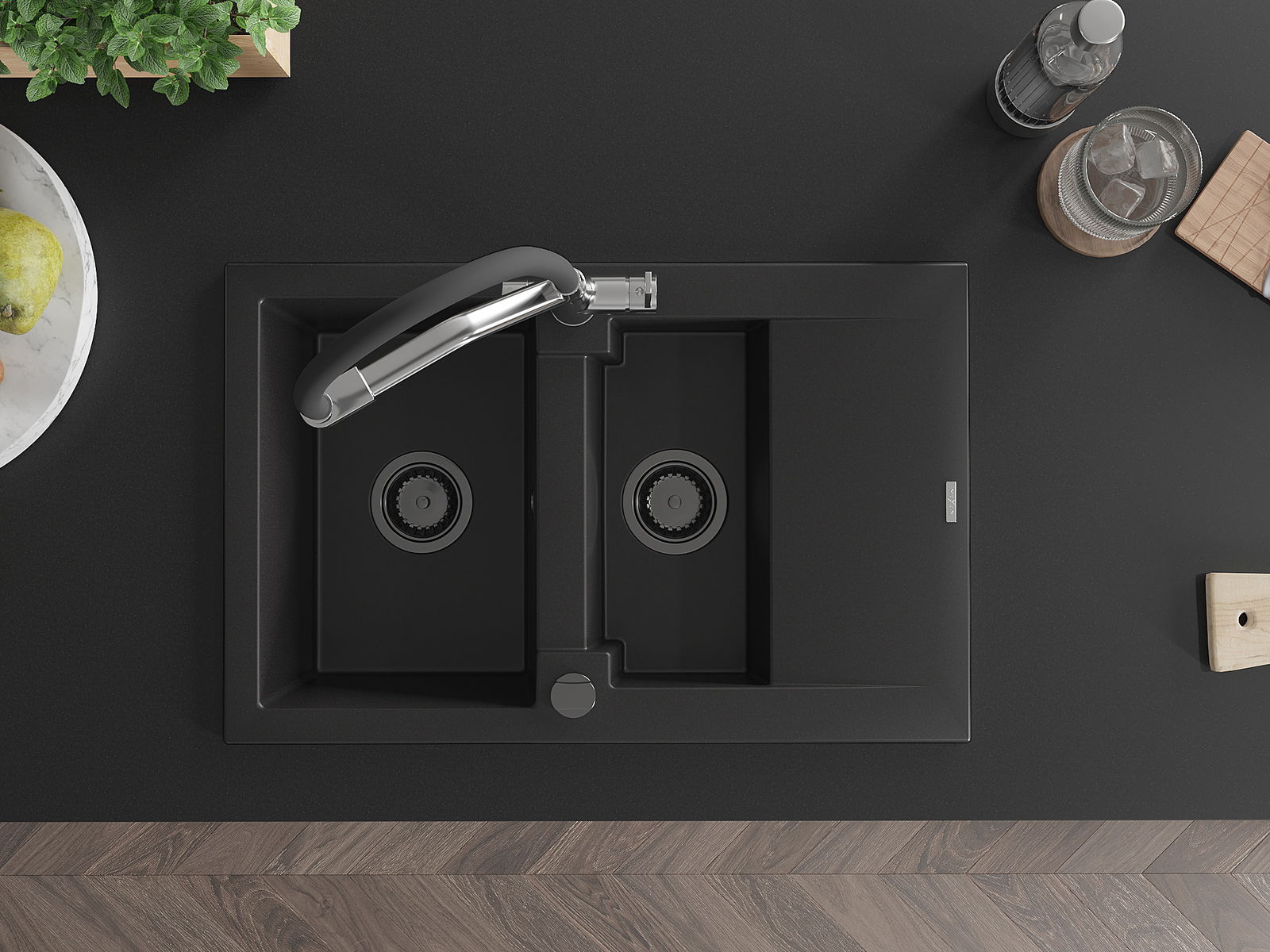 Mexen Gaspar granieten gootsteen 1,5-komor met druiprek en Duo keukenmengkraan, zwart - 6507-77-671701-07-B