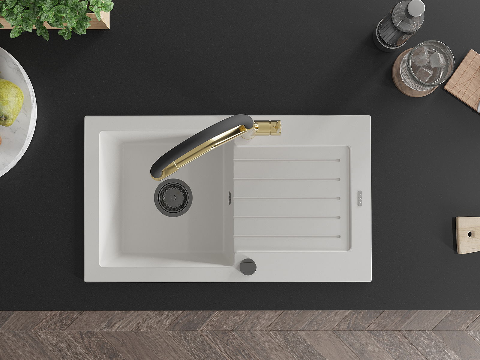 Mexen Pablo granieten spoelbak met 1 bak, druiprek en Duo keukenmengkraan, wit - 6510-20-671701-57-B