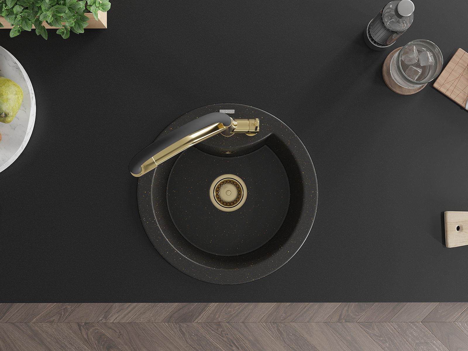De spoelbak heeft een voorgesneden gat met een diameter van 35 mm voor eenvoudige verwijdering. Dit gat kan bijvoorbeeld worden gebruikt om een vloeistofdispenser te installeren, waardoor plastic flessen in de keuken overbodig zijn en een elegante afwerking ontstaat.