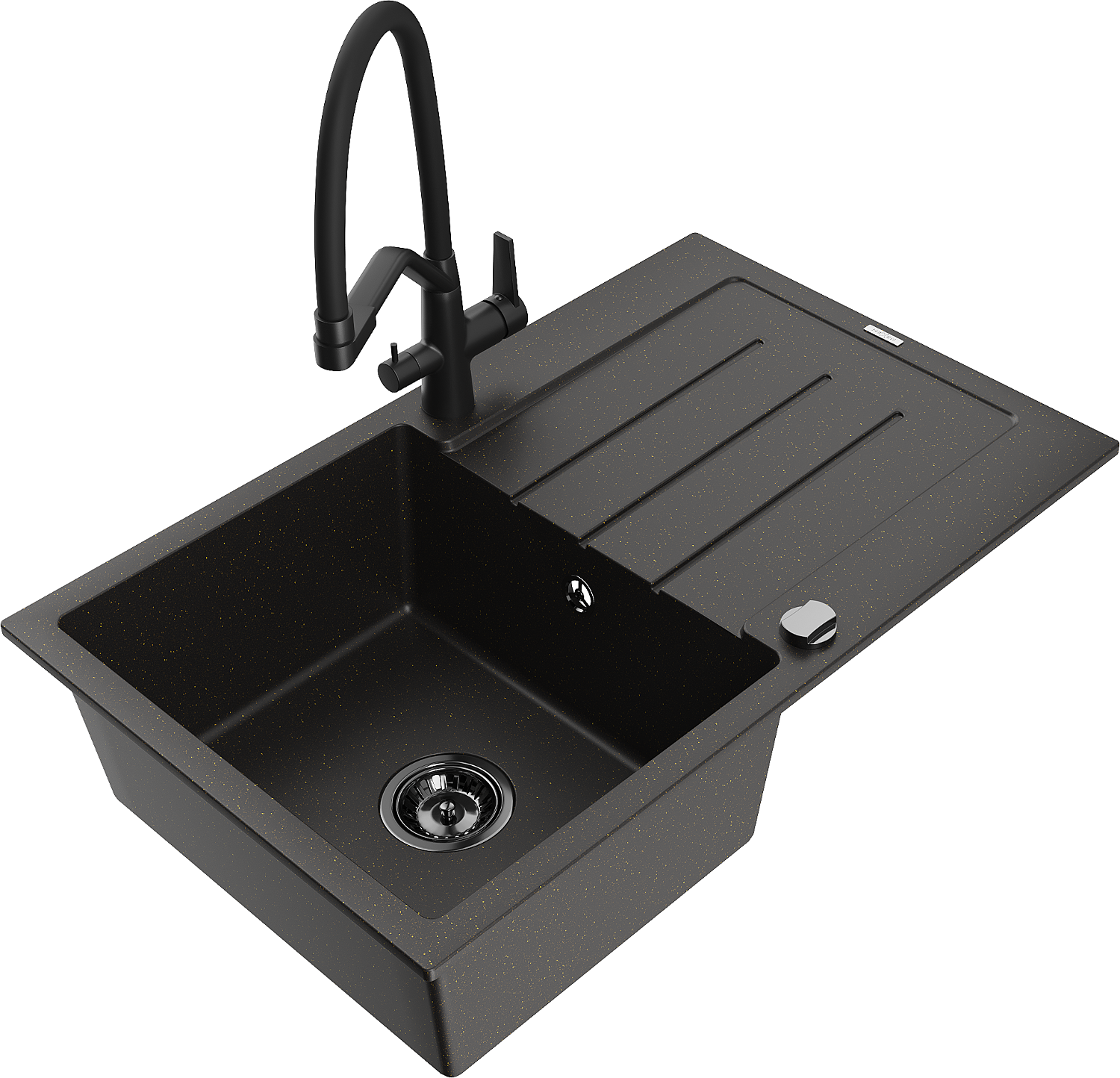 Mexen Bruno granieten gootsteen 1-kompartment met afdruiprek en keukenkraan Duo, zwart/goud metallic - 6513-75-671701-70-B