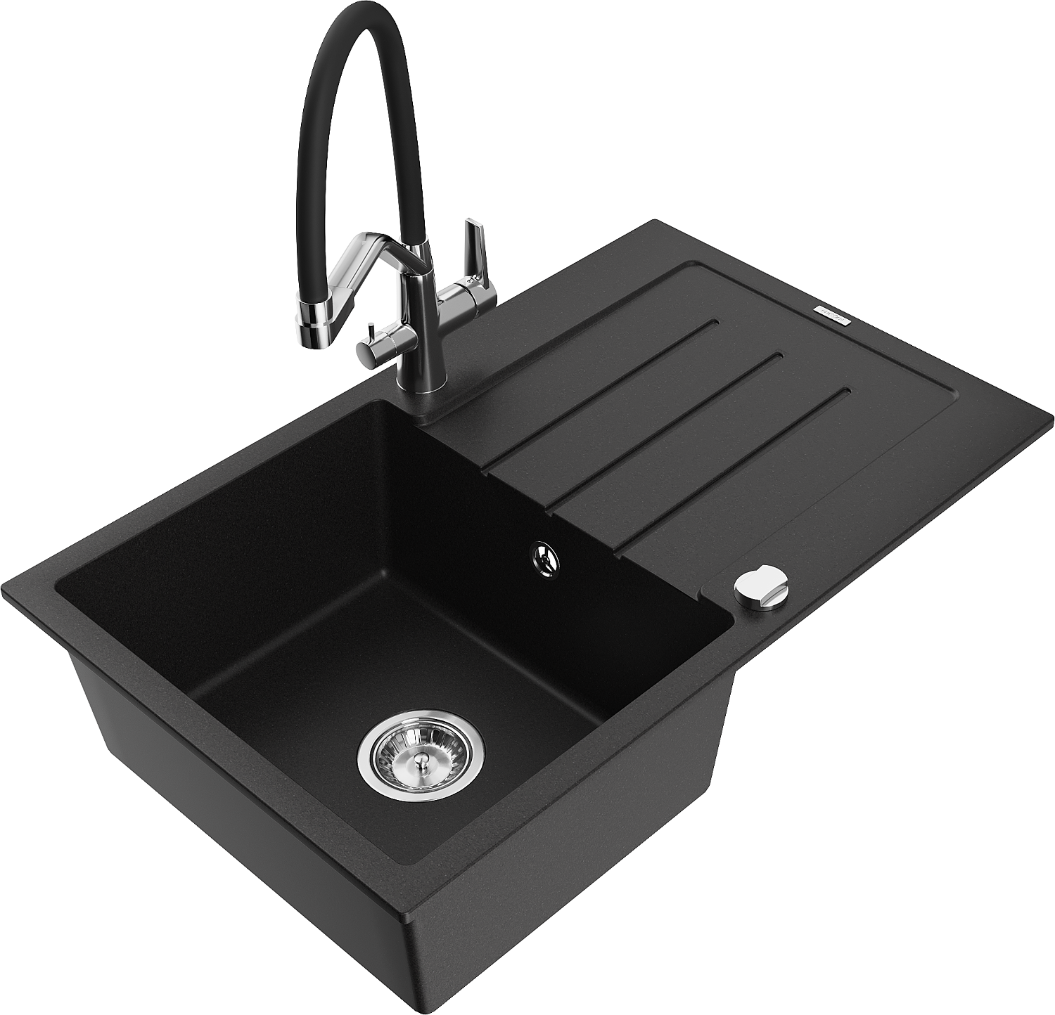 Mexen Bruno granieten gootsteen 1-komorig met afdruiprek en keukenmengkraan Duo, zwart - 6513-77-671701-07