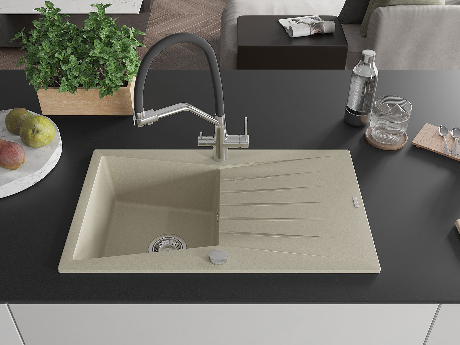 De gootsteen is gemaakt van hoogwaardig graniet. Het vormt een elegante en vooral praktische aanvulling op elke keuken, ongeacht de stijl. De hoge kwaliteit en duurzaamheid van graniet zorgen voor jarenlang gebruik.