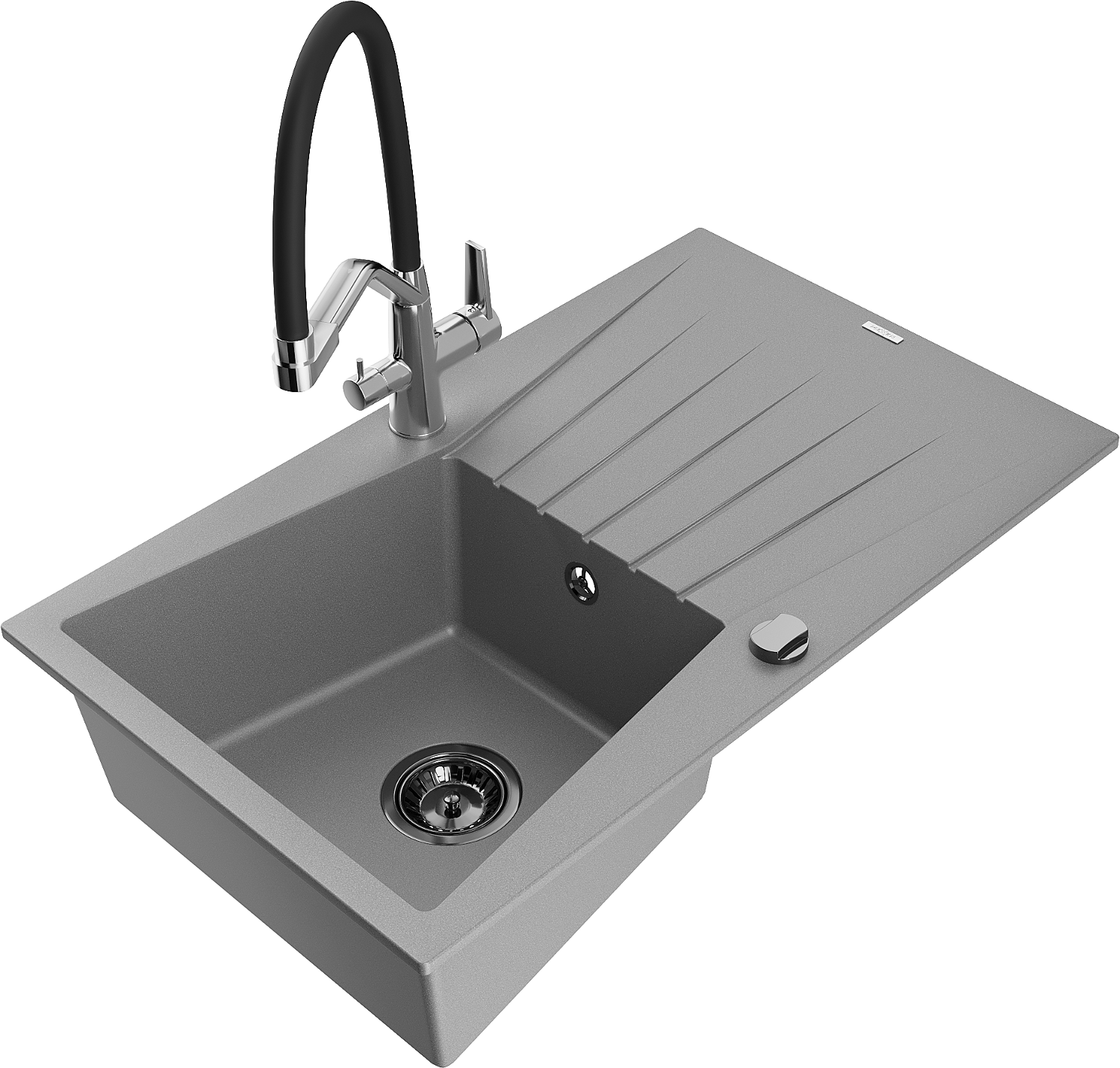 Mexen Cesar granieten gootsteen 1-kommer met afdruiprek en keukenmengkraan Duo, grijs - 6514-71-671701-07-B