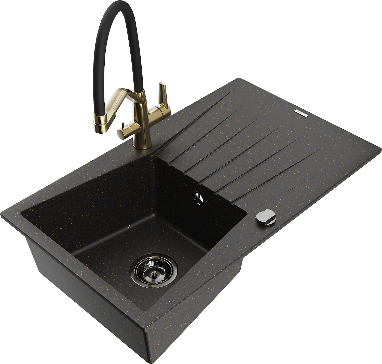 Mexen Cesar granieten spoelbak 1-komor met afdruiprek en keukenkraan Duo, zwart/goud metallic - 6514-75-671701-57-B