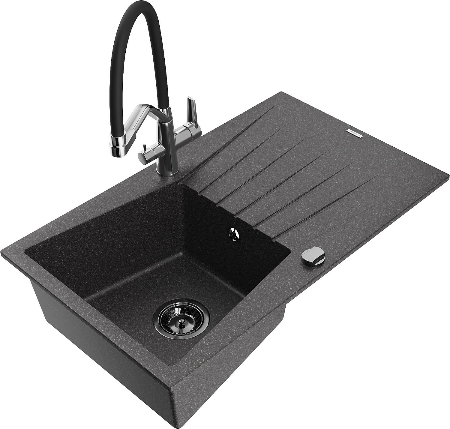 Mexen Cesar granieten gootsteen 1-kamers met afdruiprek en keukenmengkraan Duo, zwart gespikkeld - 6514-76-671701-07-B