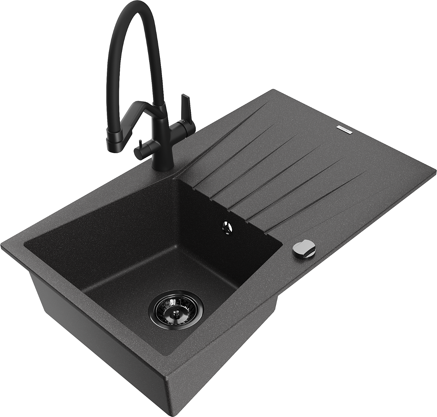 Mexen Cesar granieten gootsteen met 1 bak, afdruiprek en Duo keukenkraan, zwart gespikkeld - 6514-76-671701-70-B