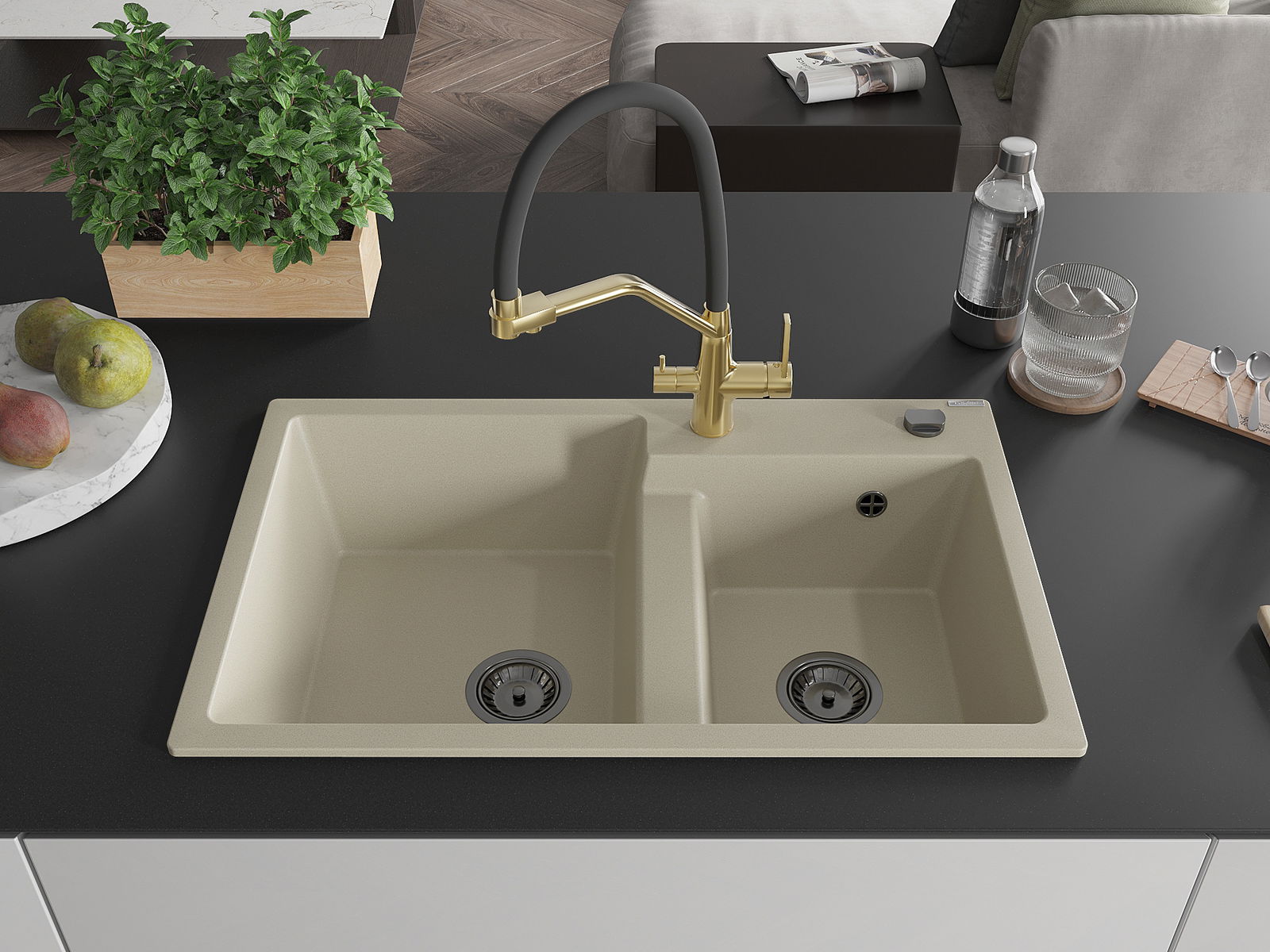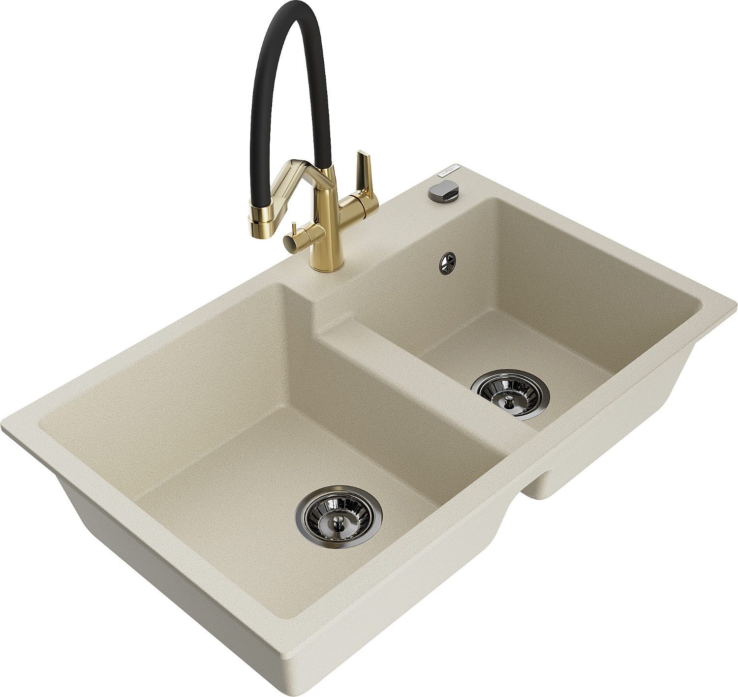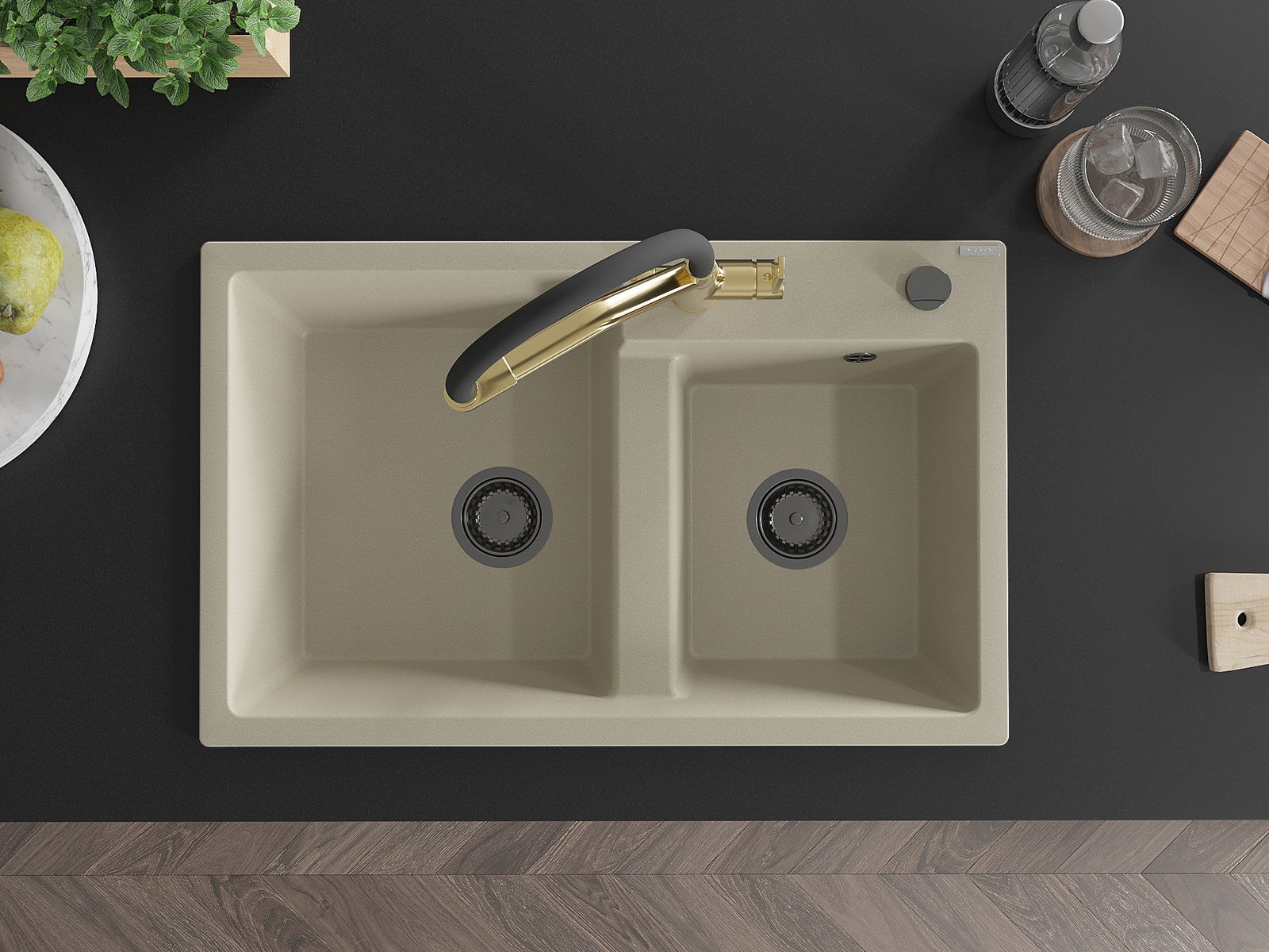 Mexen Tomas granieten gootsteen met 2 kamers en keukenmengkraan Duo, beige - 6516-69-671701-57-B