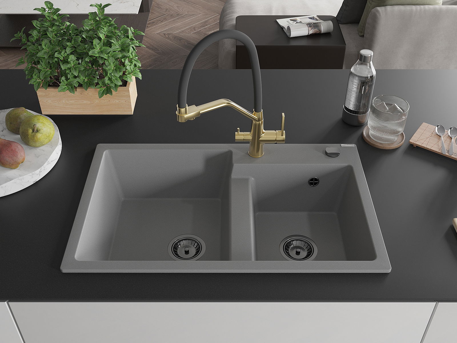 Mexen Tomas granieten gootsteen 2-kamer met keukenmengkraan Duo, grijs - 6516-71-671701-57-B
