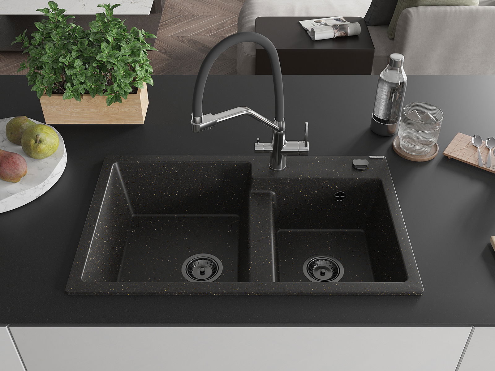 Mexen Tomas granieten spoelbak met 2 kamers en keukenkraan Duo, zwart/gouden metallic - 6516-75-671701-07-B