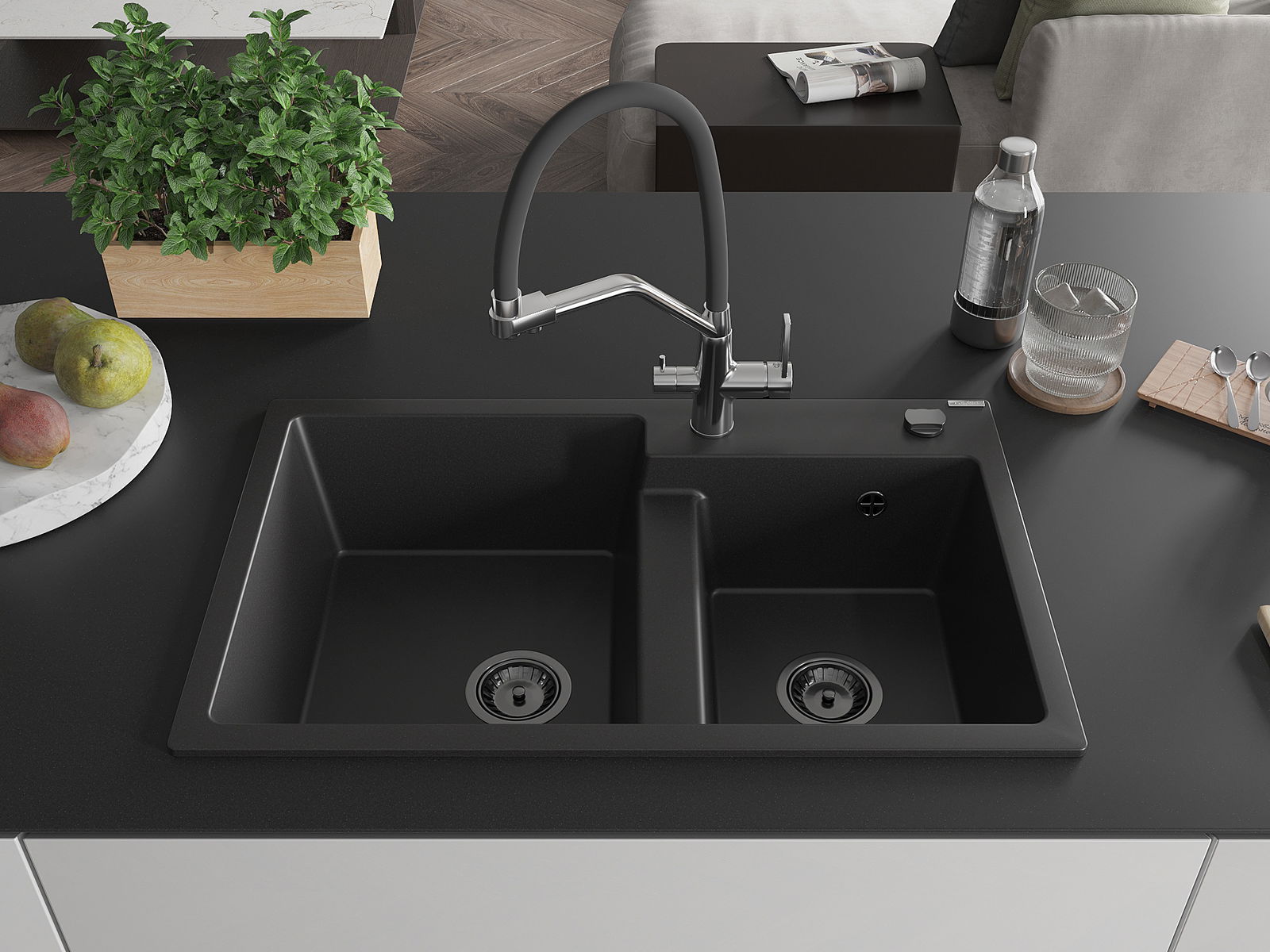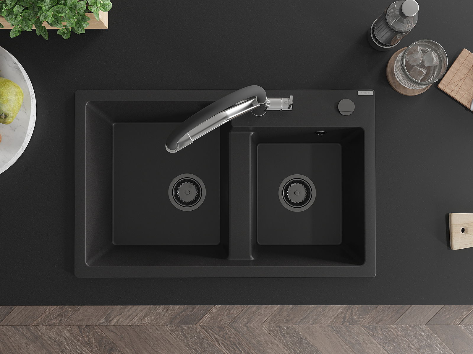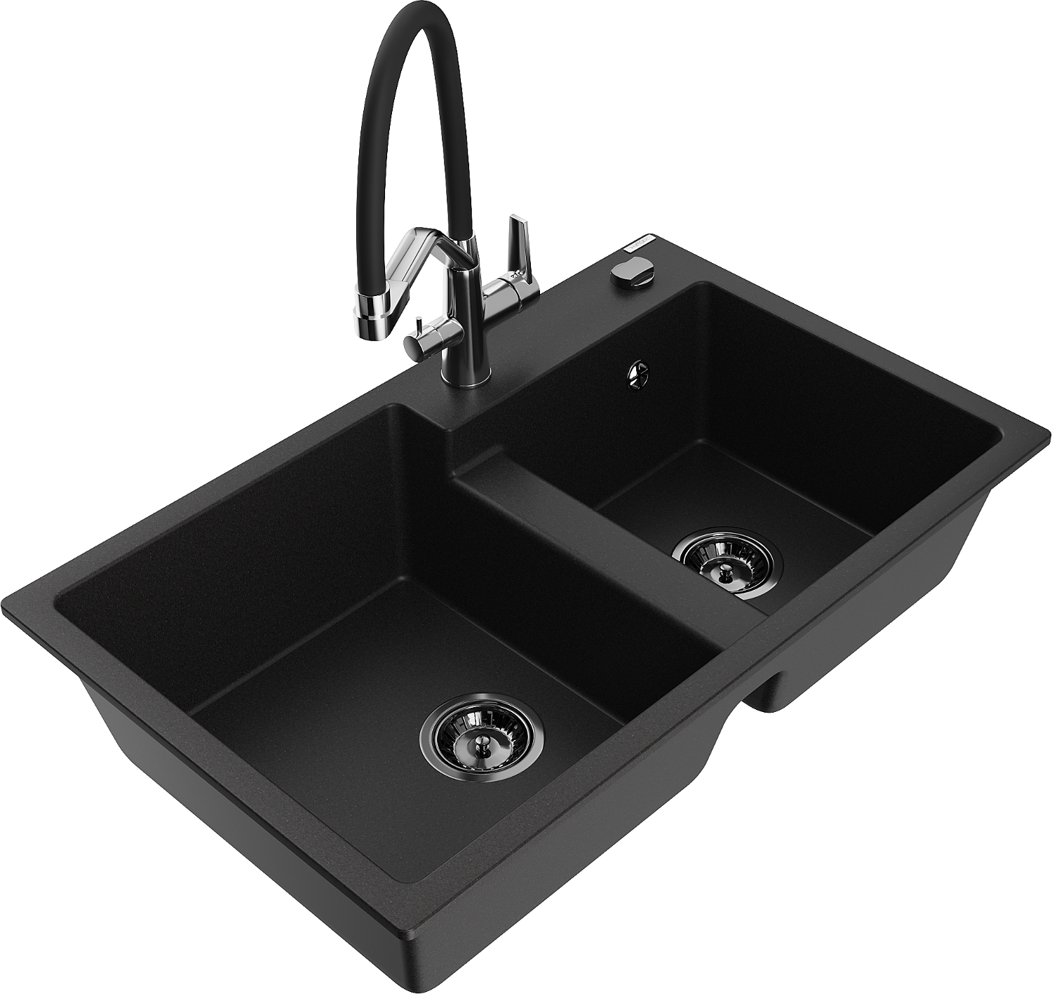 Mexen Tomas granieten spoelbak met 2 kamers en keukenmengkraan Duo, zwart - 6516-77-671701-07-B