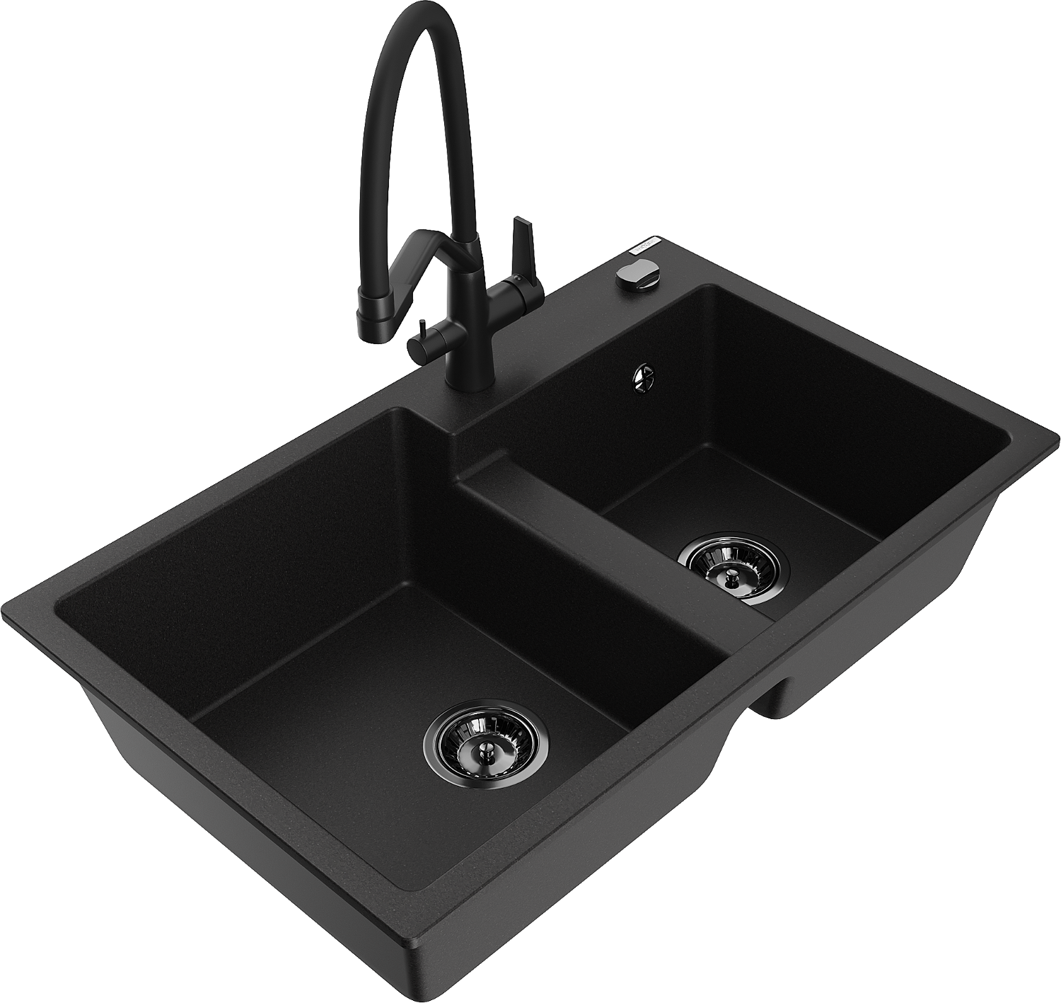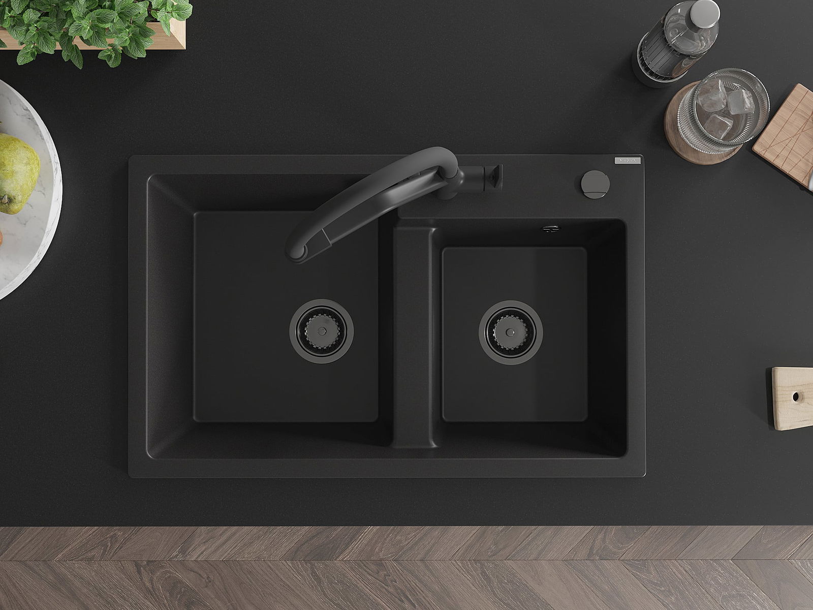 Mexen Tomas granieten spoelbak met 2 compartimenten en Duo keukenkraan, zwart - 6516-77-671701-70-B