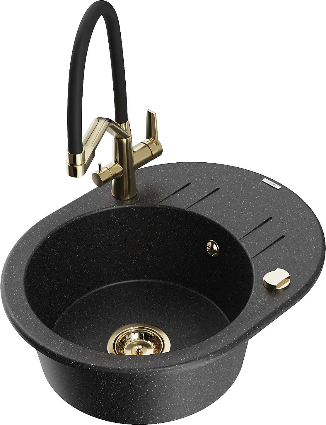 Mexen Kevin granieten gootsteen met 1 bak met dubbele keukenmengkraan, zwart/zilver metallic - 6517-73-671701-57-G