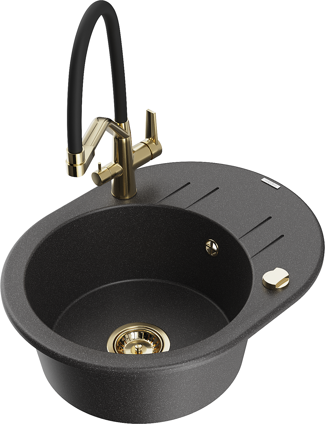 Mexen Kevin granieten spoelbak 1-kom. met dubbele keukenkraan, zwart gespikkeld - 6517-76-671701-57-G