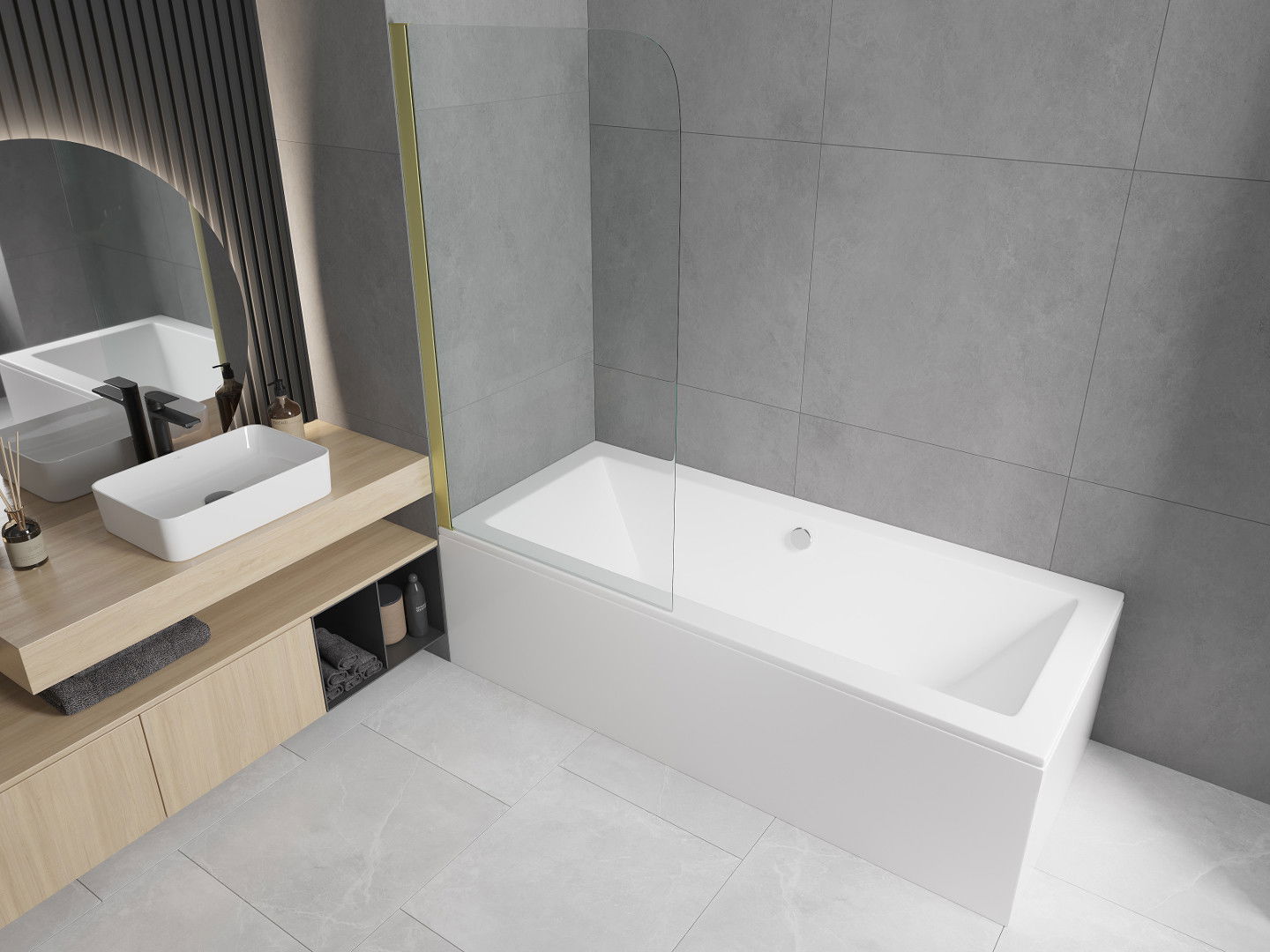 Het scherm heeft één beweegbare vleugel met de mogelijkheid om in te klappen. Deze oplossing bespaart meer ruimte in de badkamer en maakt het mogelijk om vrij gebruik te maken van de resterende ruimte wanneer we de badzone niet gebruiken.