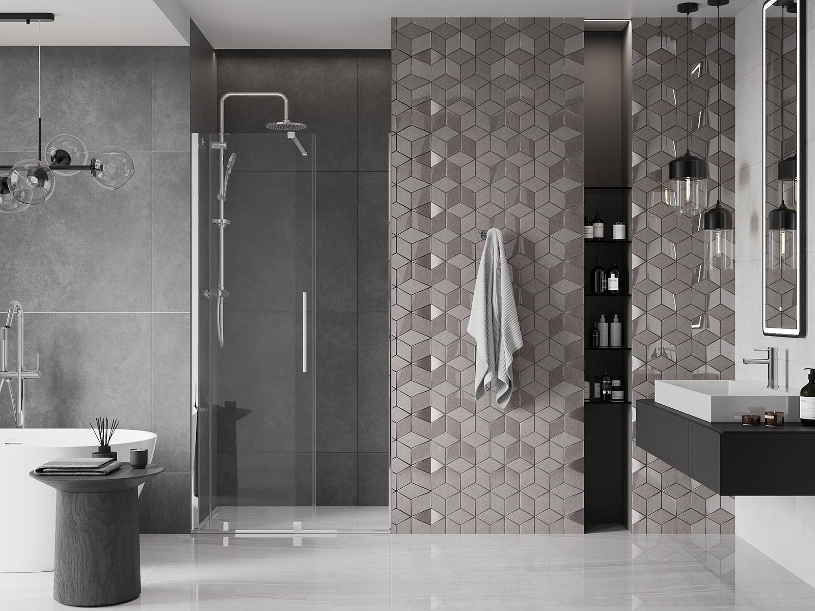 Het handige en comfortabele handvat is gemaakt van roestvrij staal. De modieuze vorm in combinatie met de afwerking die is afgestemd op de kleur van de profielen geeft het geheel een moderne en stijlvolle uitstraling, en benadrukt de esthetiek van elke badkamer.