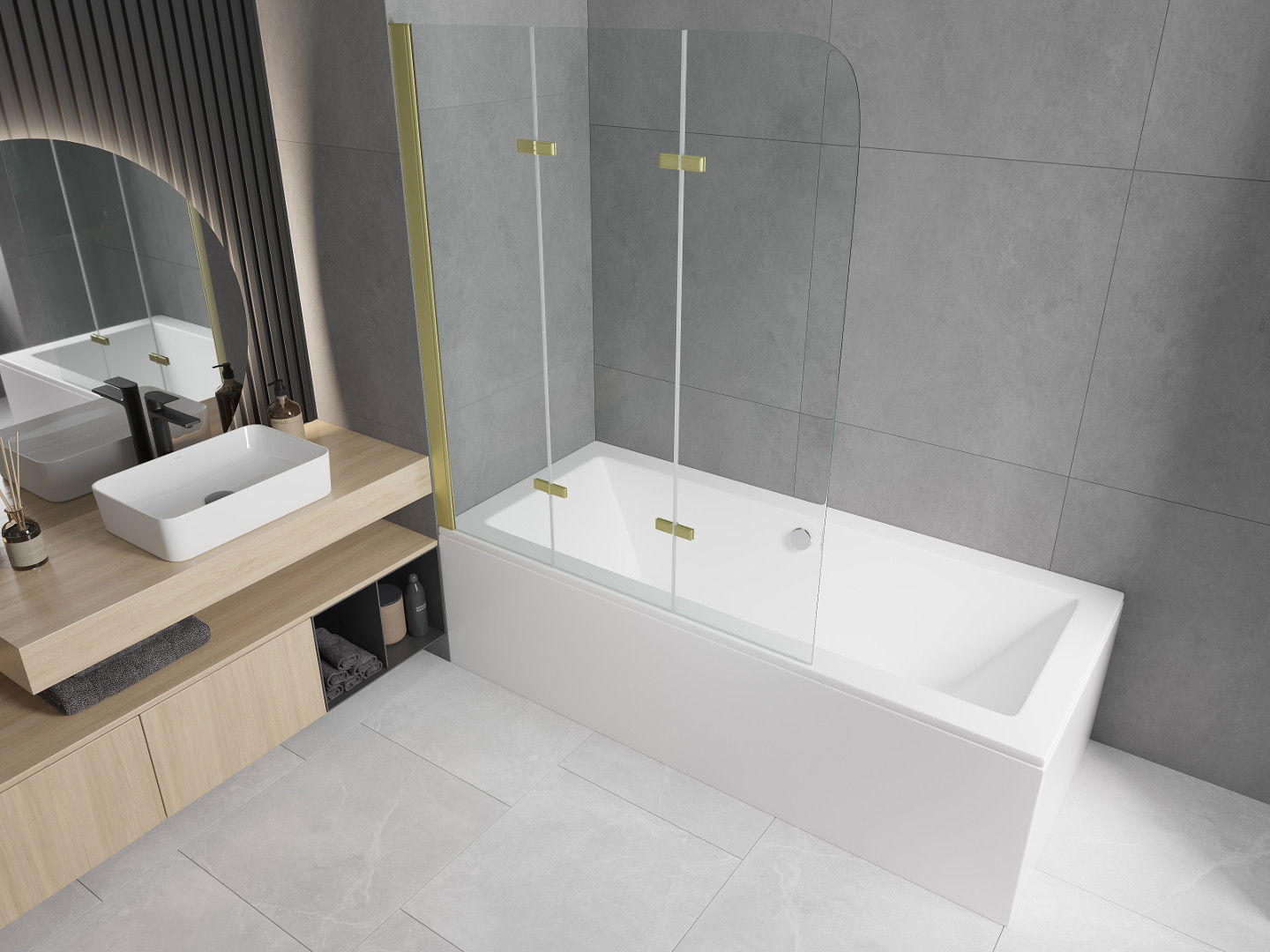 Het scherm bestaat uit drie opvouwbare vleugels. Deze oplossing bespaart ruimte in de badkamer en zorgt ervoor dat u de resterende ruimte vrij kunt gebruiken wanneer u de badkamer niet gebruikt.